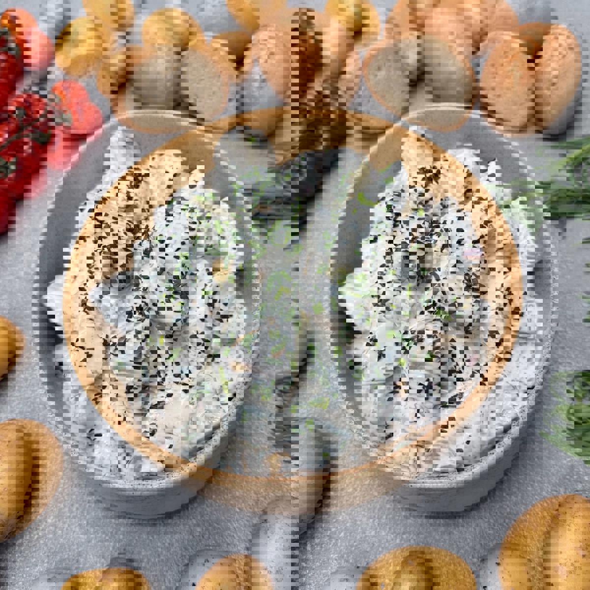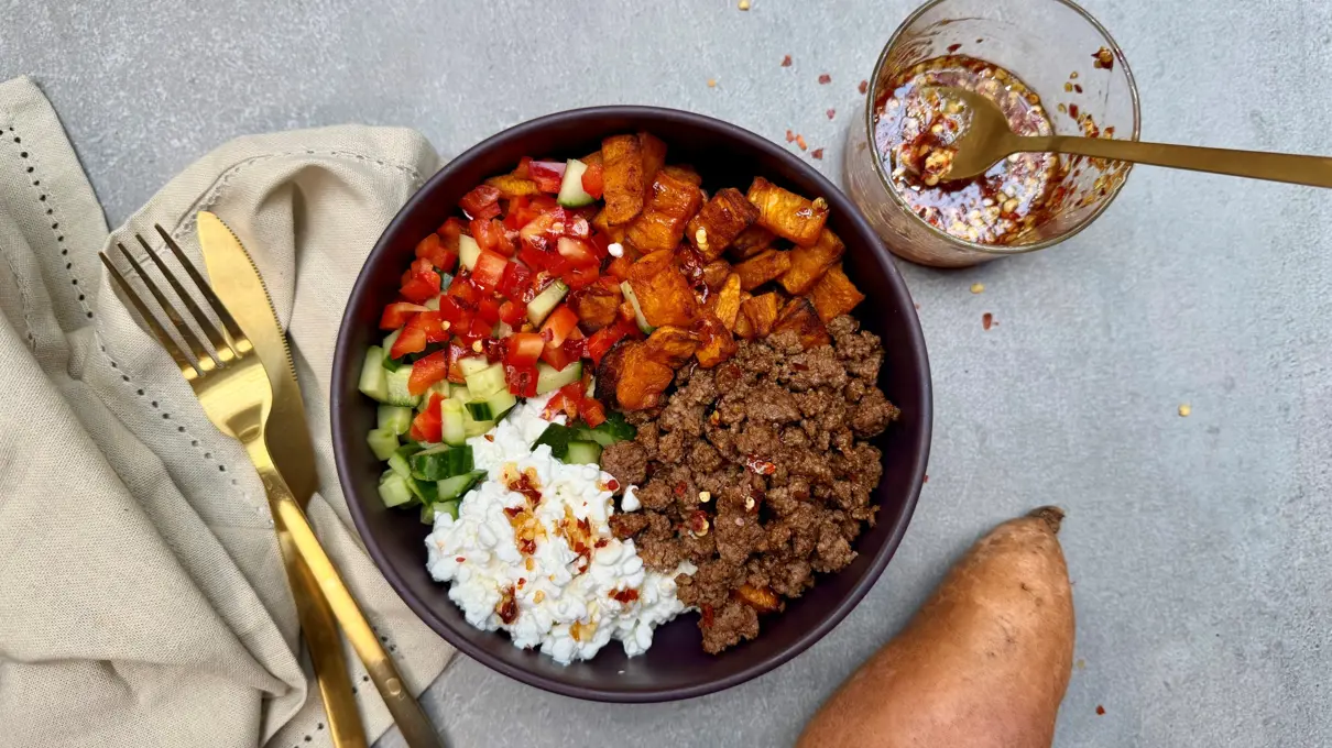 Hytteost bowl med bagte søde kartofler