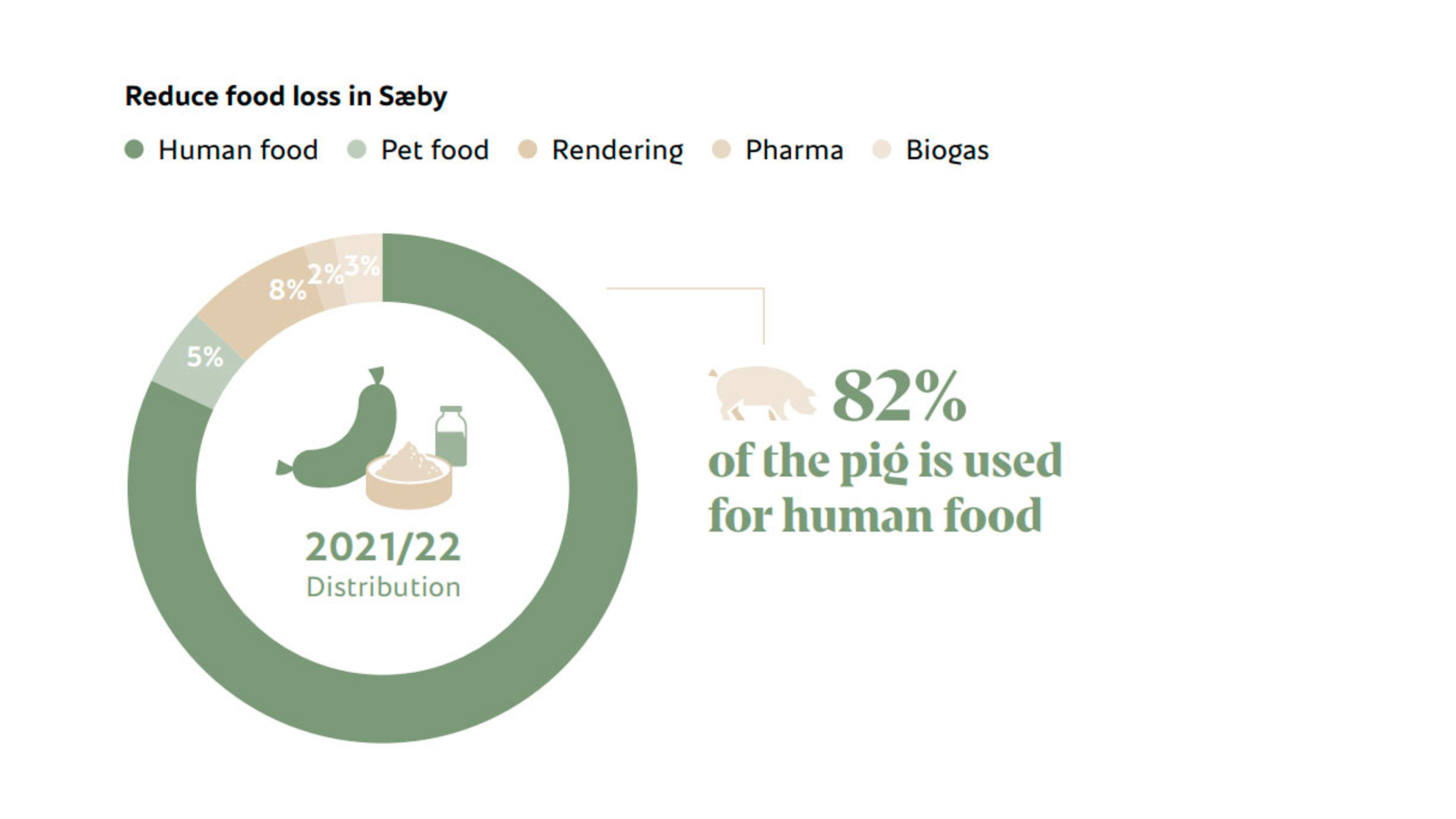 - Fødevaretab og madspild i produktionen: Vi bestræber os på at bruge alle dele af dyret og øvrige råvarer mest hensigtsmæssigt på vores produktionsanlæg.