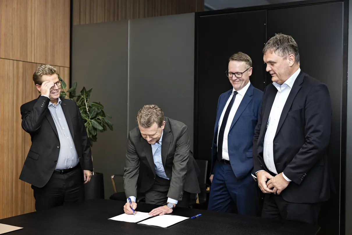 De fire CEO's var samlet for at underskrive partnerskabet for det nye initiativ. Fra venstre mod højre er det hhv. Peder Tuborgh (Arla), Kristian Hundebøll (DLG), Henning Haahr (Danish Agro) og Jais Valeur (Danish Crown) Foto: Niels Hougaard.