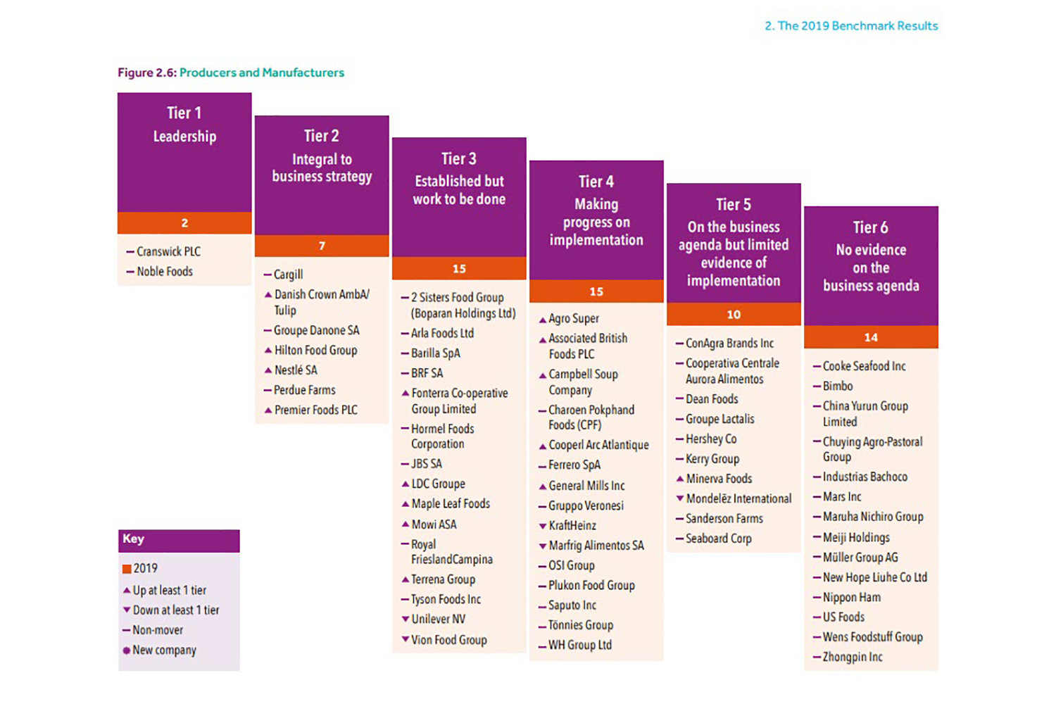 Ud over virksomhedens placering rapporterer BBFAW 2019, at 60 procent af verdens førende fødevarevirksomheder nu har formelle landbrugsdyrevelfærdspolitikker samt passende styringsprocesser for at sikre, at de effektivt implementeres internt og gennem forsyningskæder.