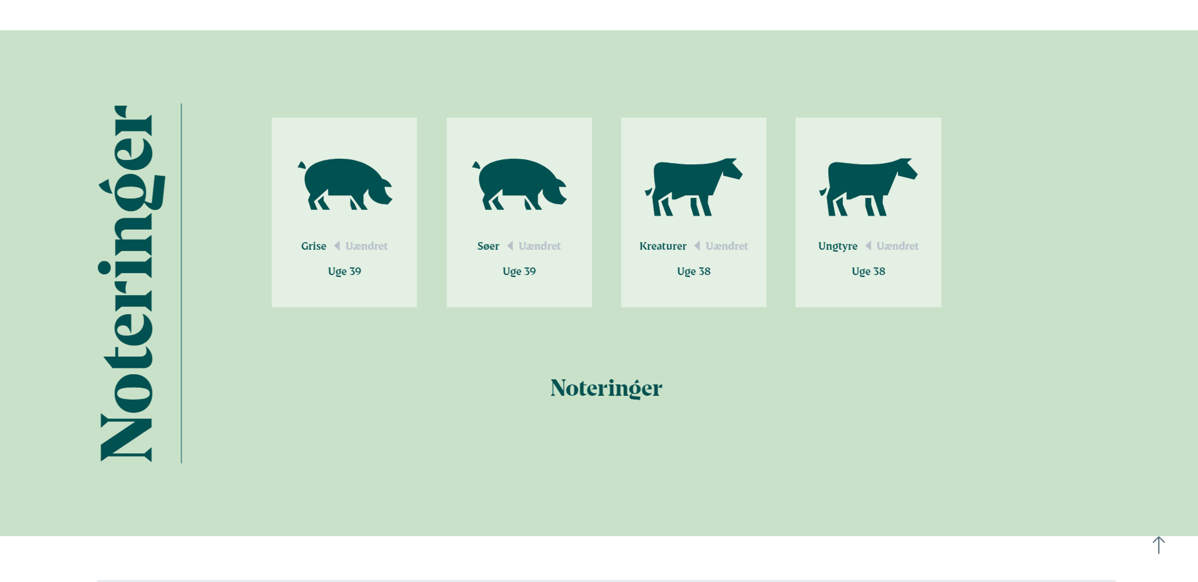 Du kan altid finde noteringerne på forsiden af danishcrown.dk ved at scrolle ned til bunden af siden. Her vil du finde noteringerne for både grise og kreaturer, og du kan trykke på hver enkelt kategori for at få flere oplysninger samt den historiske notering.