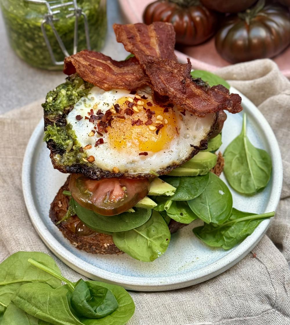 Åben toast med æg, bacon og avocado