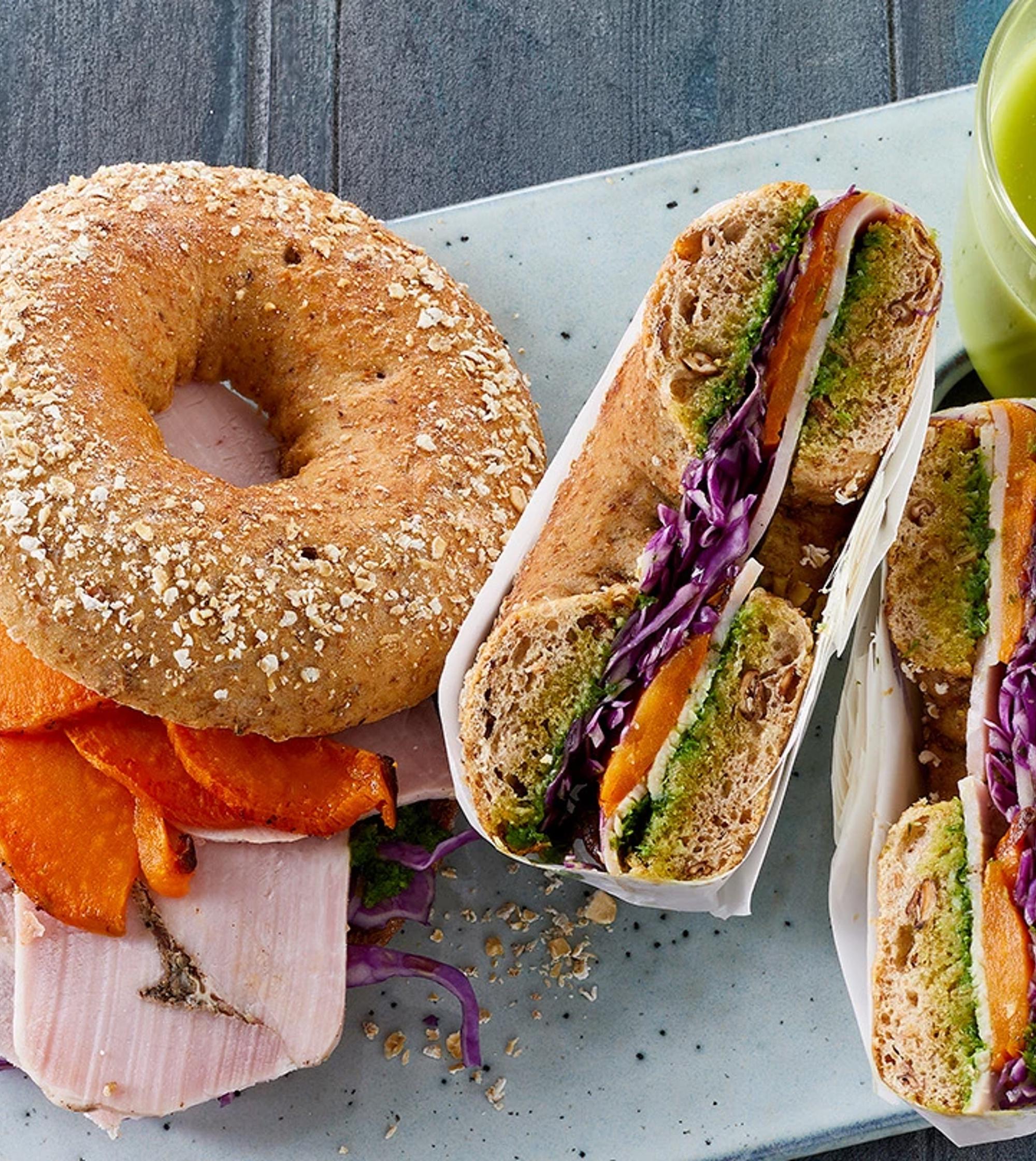 Grov bagel med rullepølse og søde kartofler