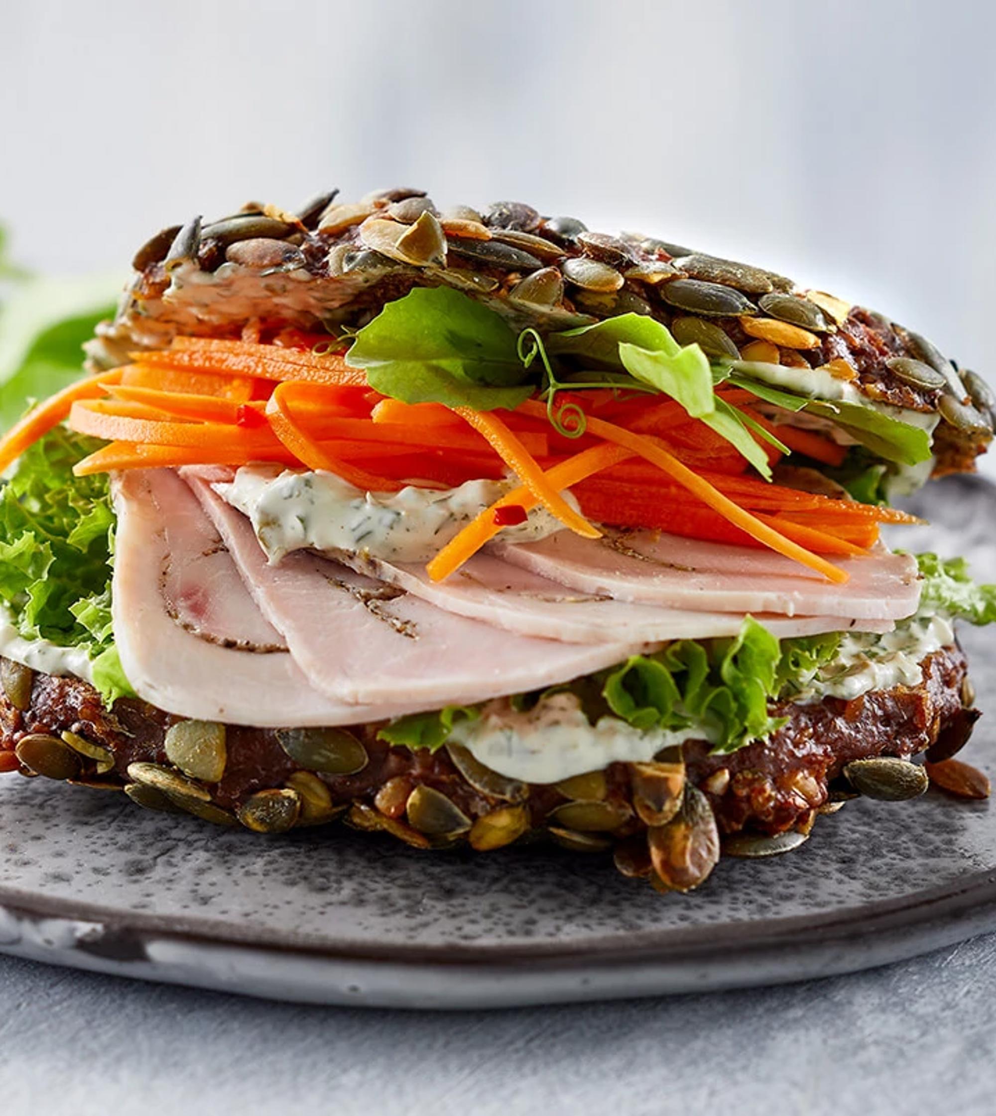 Rugbrødssandwichbolle med hamburgerryg og tzatziki