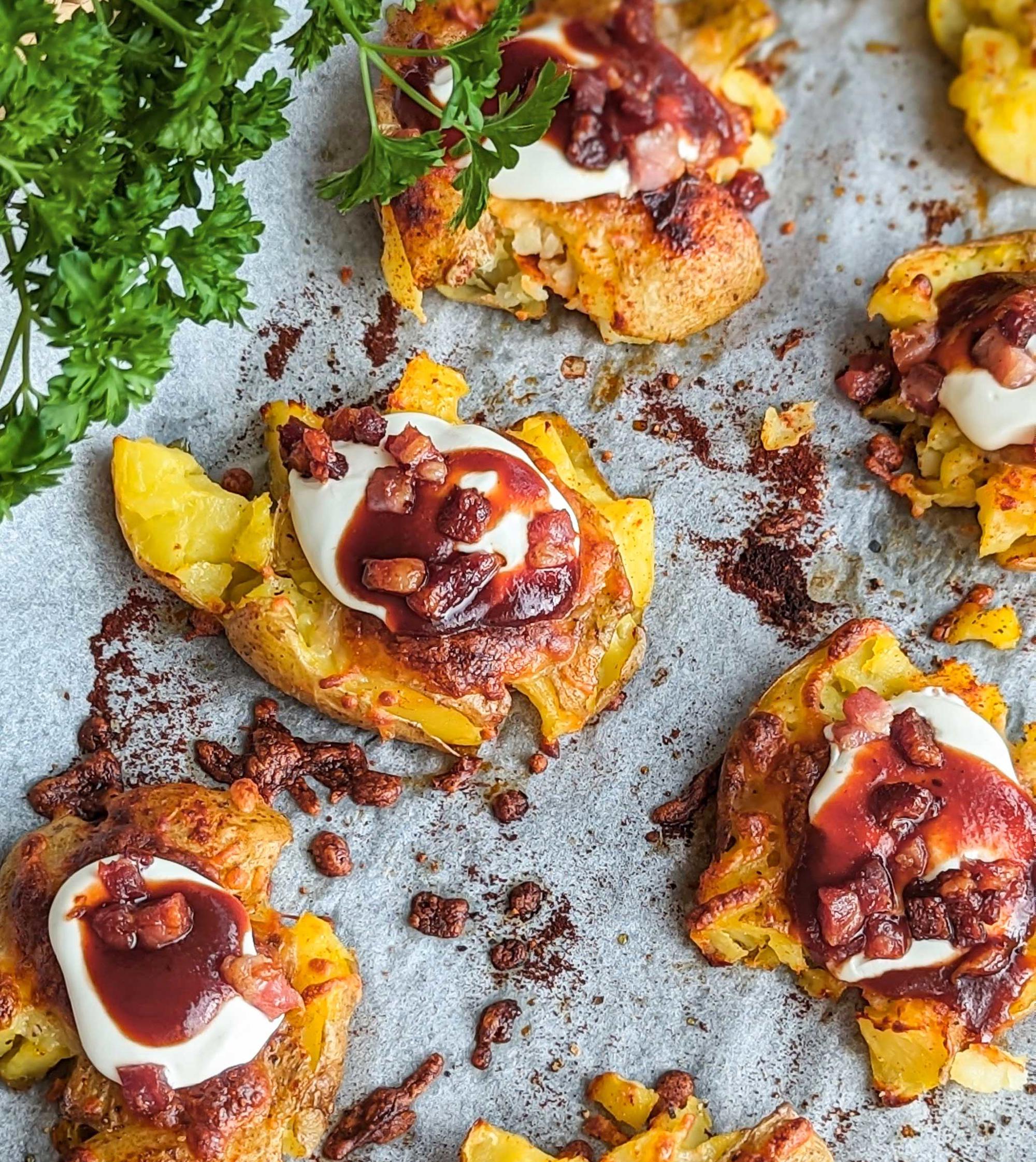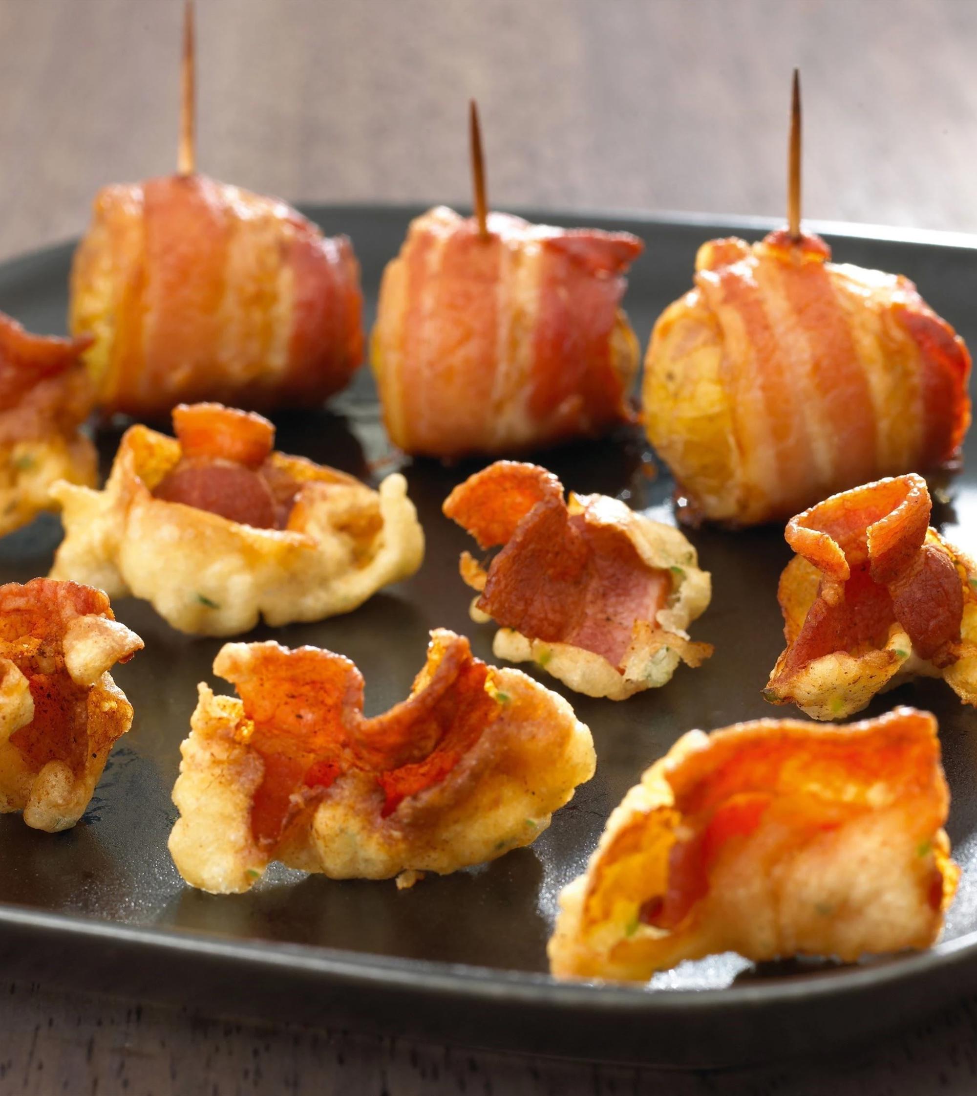 Kartofler svøbt i bacon med cheddarost og cremefraice fyld