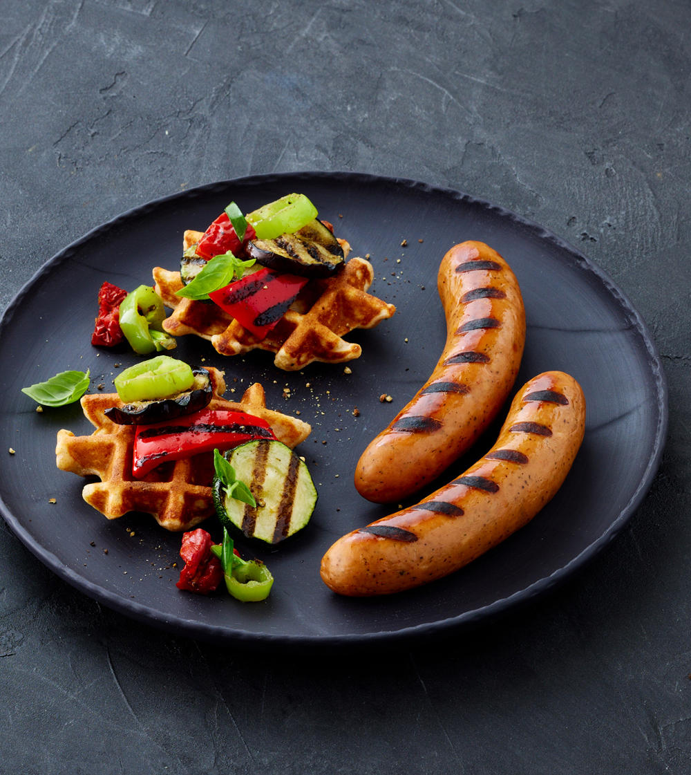 Sprøde vafler med grillet grønt og pølser