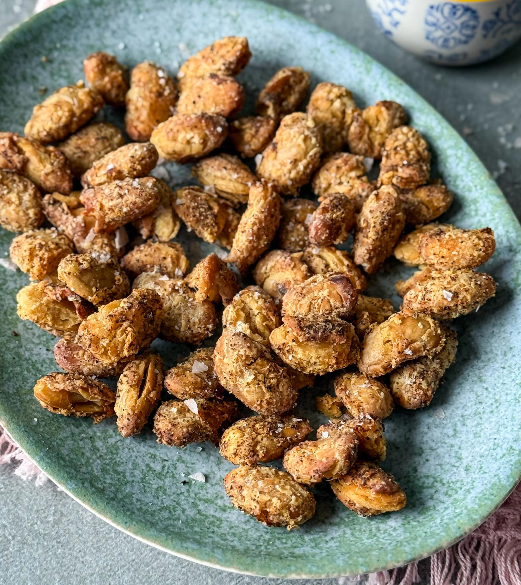Glaserede nakkekoteletter med ovnbagte sprøde bønner og fetadrys