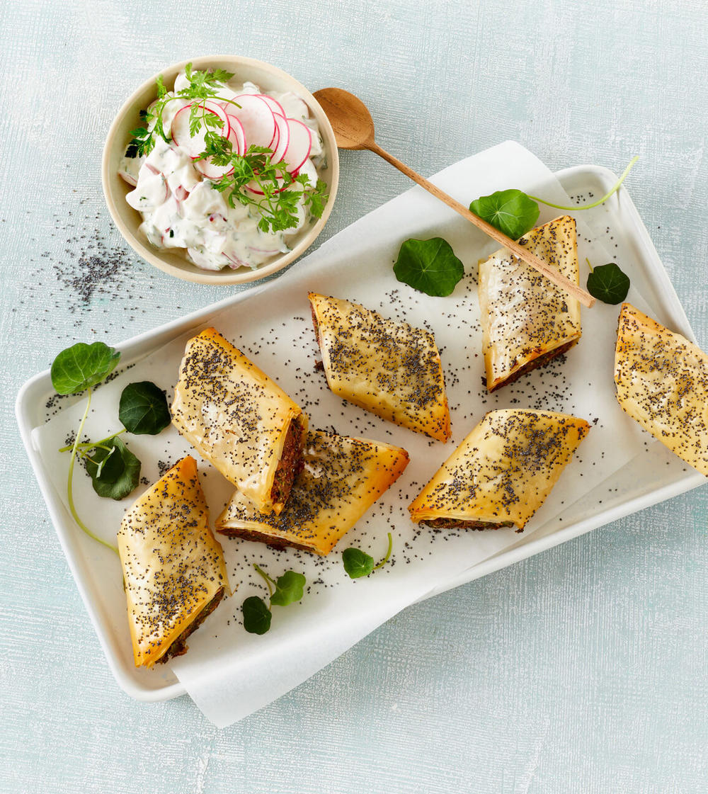 Rugbrødssandwichbolle med hamburgerryg og tzatziki