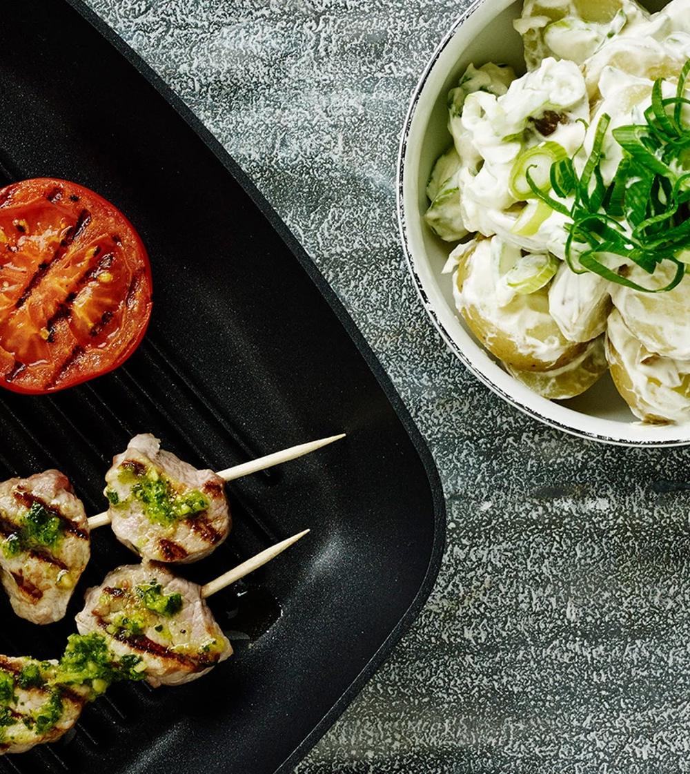 Grillspyd med Frankfurterpølse, bøf og chimichurri marinade