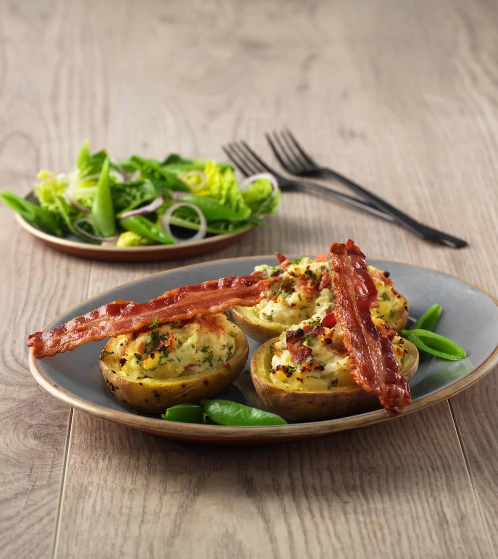 Kartofler svøbt i bacon med cheddarost og cremefraice fyld