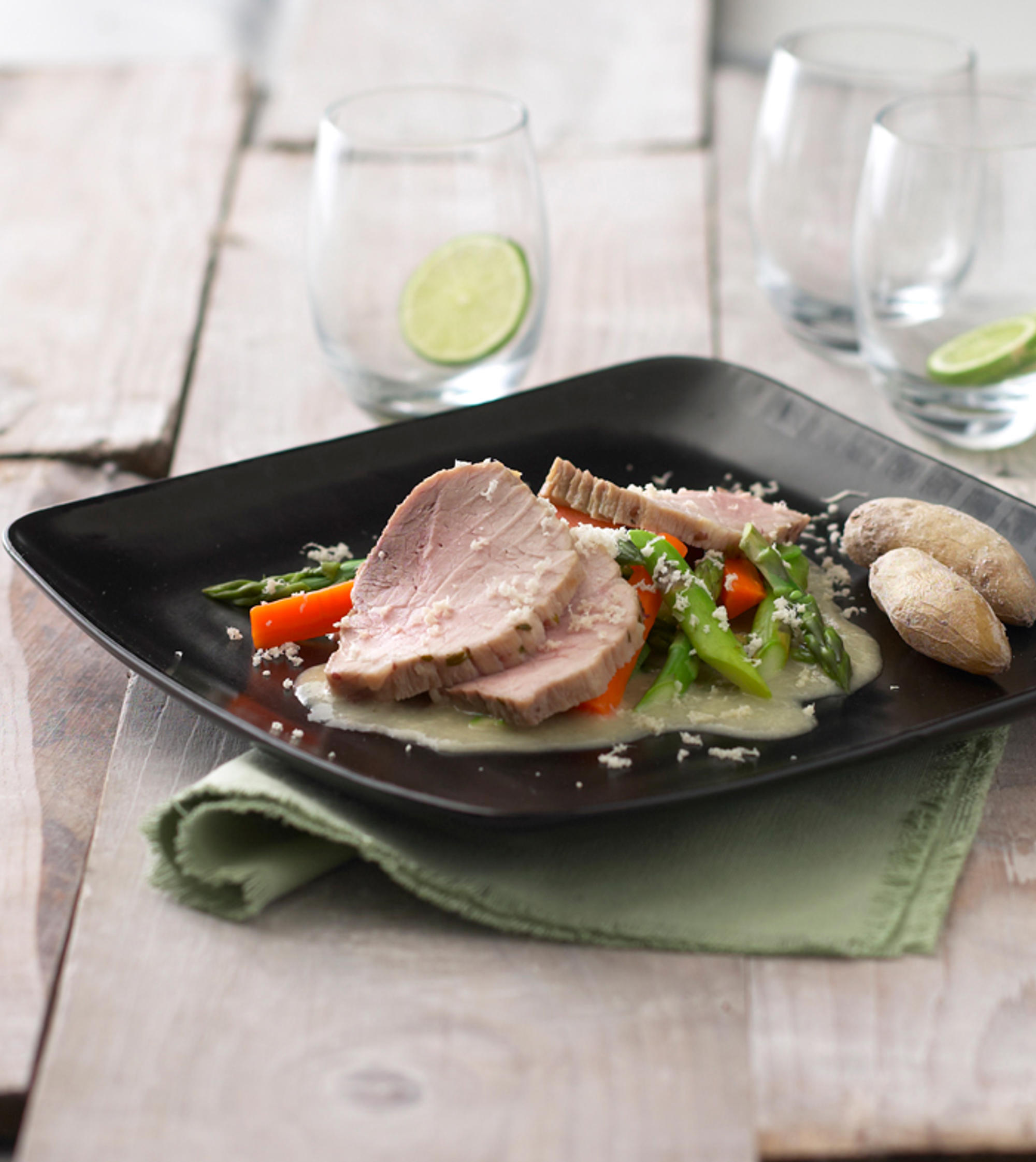 Koteletter med hvidløg, nye danske kartofler og kryddersmør