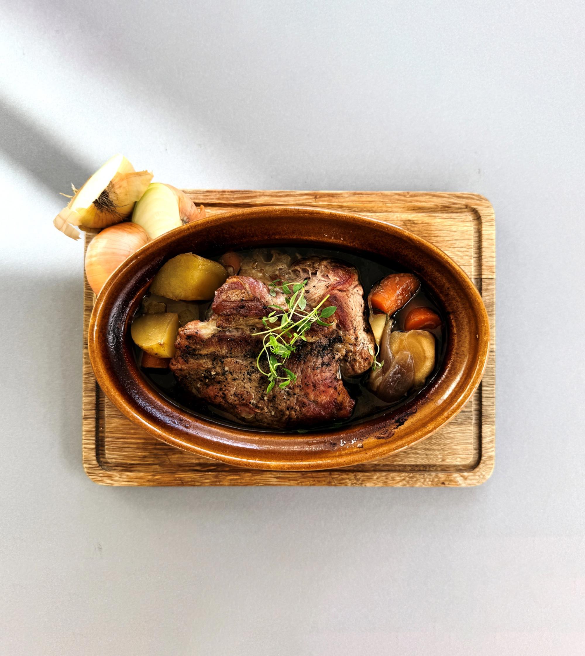 Halve løg med sursøde ribs, sprød bacon og flødefyld