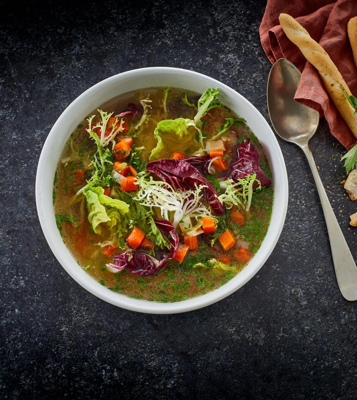 Man kan næsten ikke undgå at komme i forårshumør med denne skønne, friske grønne ærtesuppe! For hvad signalerer forår mere end grønne farver og sprøde urter? Suppen er baseret på vores gode hønsekødssuppe, og der er bestemt ikke sparet på ærterne, som lige får et hurtigt opkog i suppen, hvorefter de blendes helt ud i suppen til en cremet, lækker konsistens.