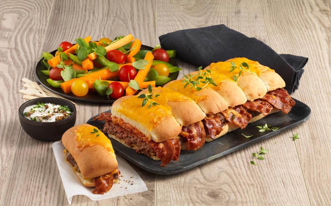 Her får du opskriften på én stor bacon and cheese burger, som kan deles ud i flere portioner. Opskriften er lavet af én pakke færdiglavet pølsebrød, så der skulle være nok til 4-6 personer her. Burgeren laves med en kæmpe oksekødsbøf og naturligvis fyldes den med sprød bacon og masser af ost. Du kan med fordel bruge denne ret til en omgang natmad.