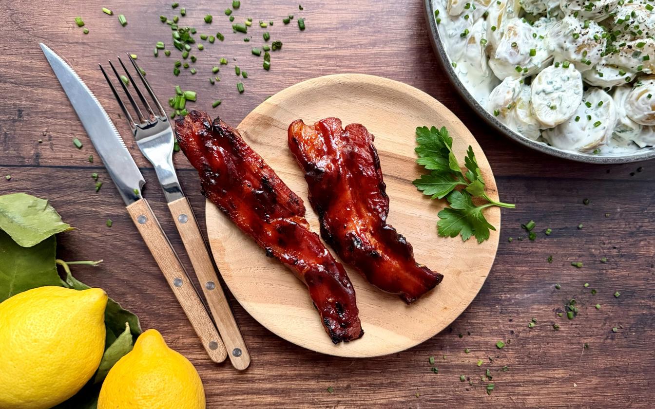 De saftige bacon steaks får en dejlig sprød og karamelliseret overflade på grillen, mens kartoffelsalaten giver modspil med både syre, friskhed og urter
