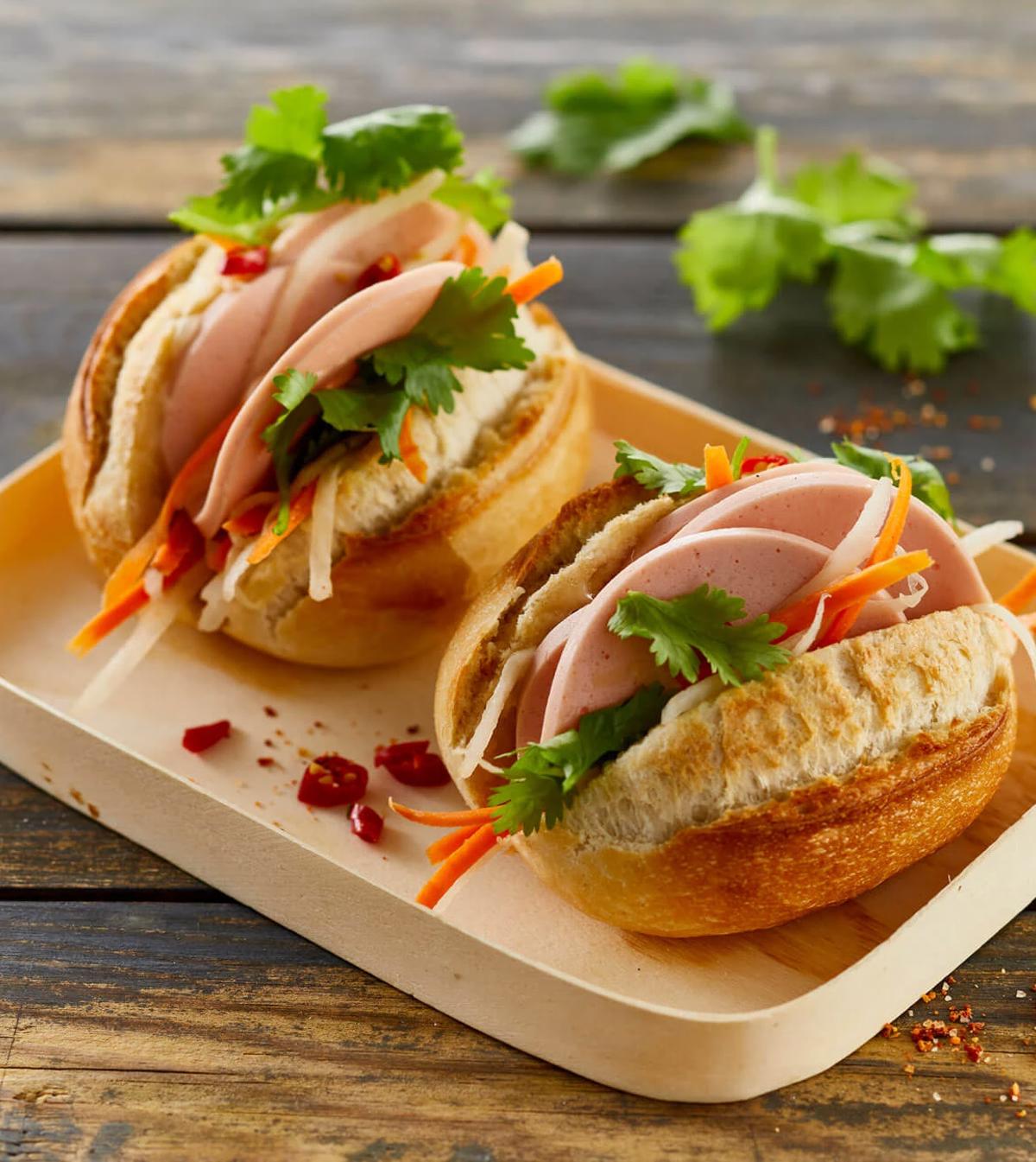 Her har vi i vores opskrift på Banh Mi brugt kyllingebryst med chili, så nyd endelig, hvordan det lille strejf af varme spiller sammen med de asiatiske smage og det sprøde brød. Og nyd også lige, at dette lækre pålæg naturligvis er nøglehusmærket. Der er masser af muligheder for at variere sandwichen – se under Tips, hvordan du kan variere fyldet.