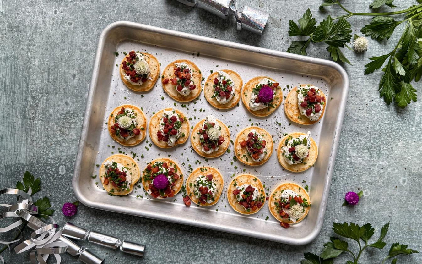 Små blinis med krydderurtecreme og sprød bacon er en uimodståelig lille servering, der passer perfekt som appetizer, snack eller en del af et større tapasbord. Den cremede topping med friskost, cremefraiche, krydderurter og citron giver en let og frisk kontrast til den salte bacon og de lune, bløde blinis. Servér dem som elegant fingermad til nytår, fest eller brunch – og pynt med friske urter eller spiselige blomster for det lille ekstra. Du kan bruge færdigkøbte blinis eller bage dem selv med vores nemme opskrift.