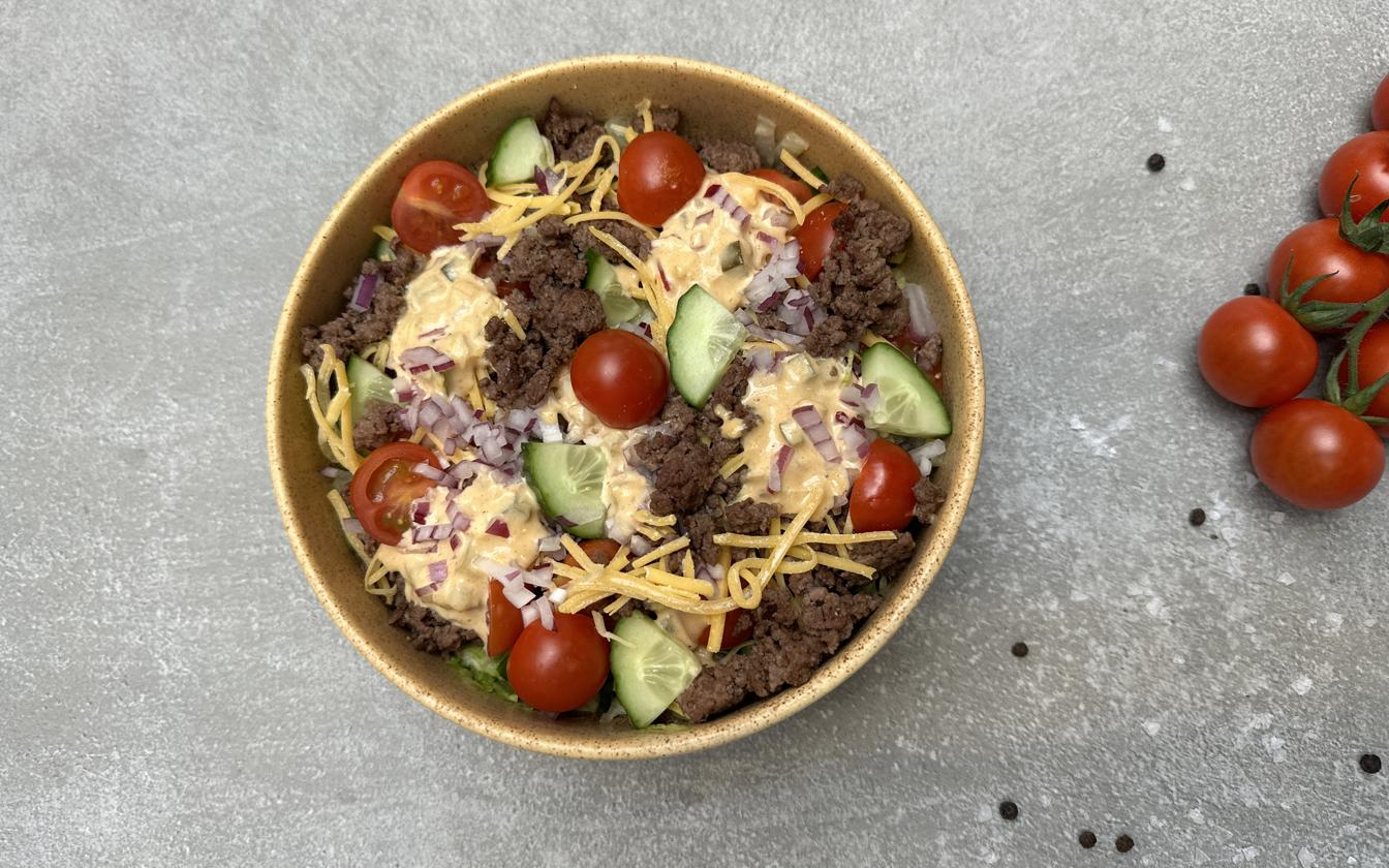 Prøv vores opskrift på en cheeseburger bowl! Denne nemme og velsmagende ret giver dig alle de klassiske smage fra en cheeseburger, men i en fyldig skål med lækre grøntsager. Opskriften er nem at lave og perfekt som et hurtigt måltid. God fornøjelse og bon appetit!