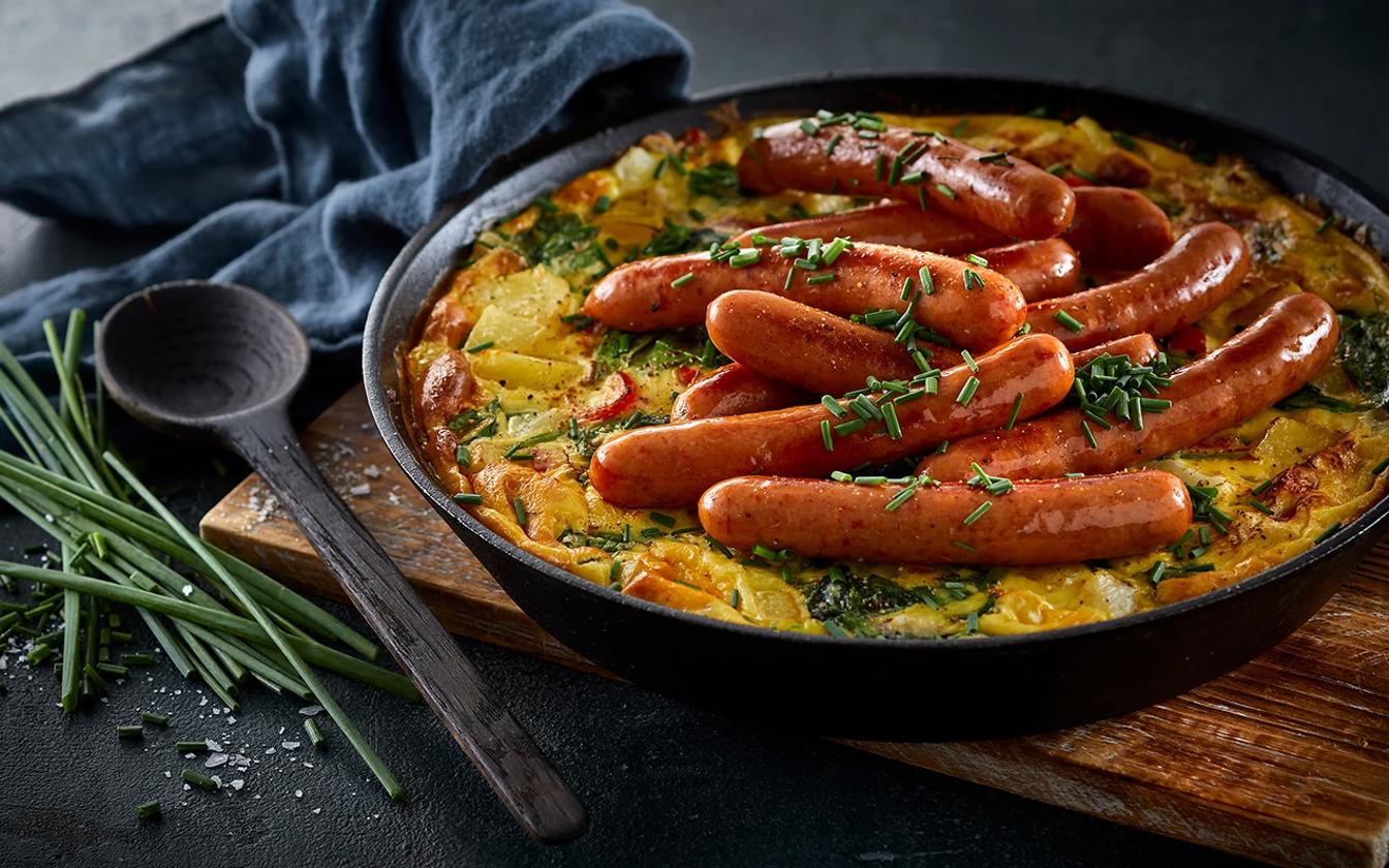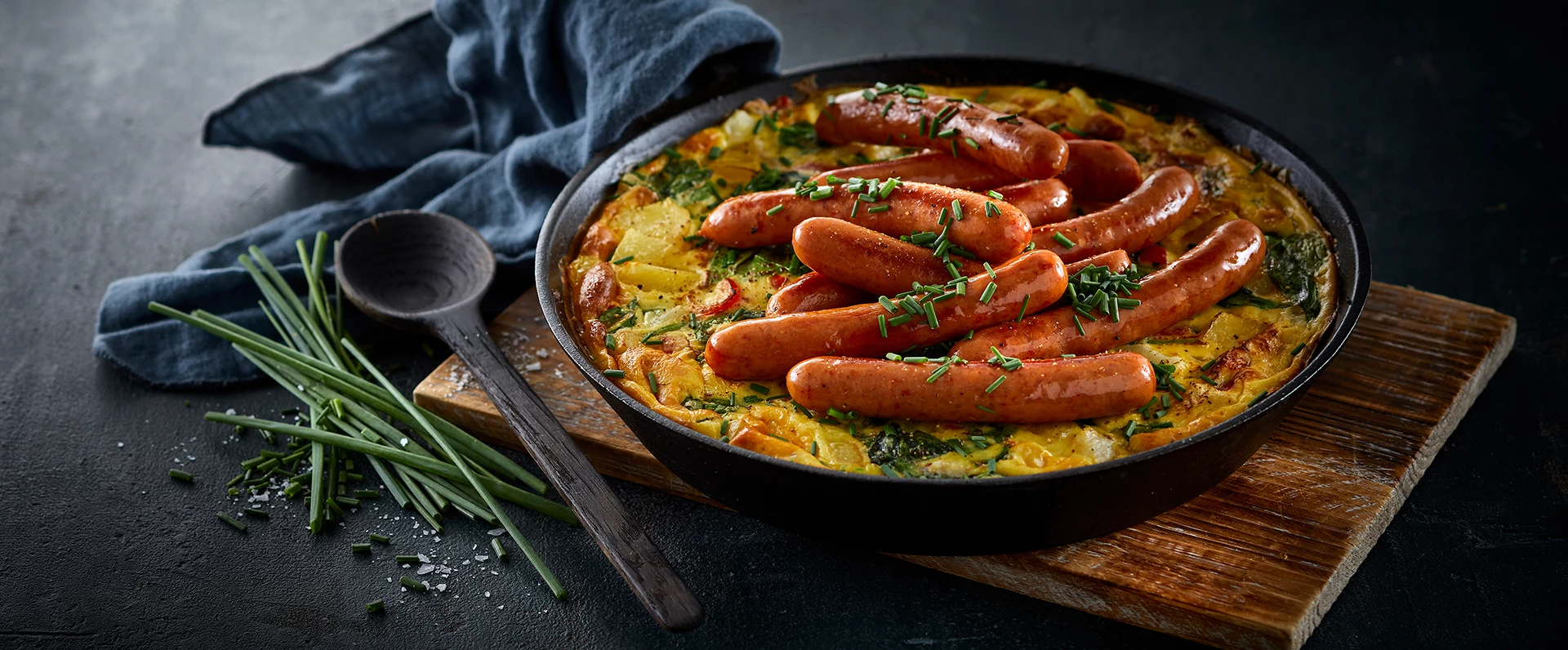 Savner du en god hverdagsret, der er lige så nem, som den er lækker? Så er vores cremede æggekage med krydrede, sprøde pølser lige noget for dig. Den er sprængfyldt med spinat og snackpeber, som giver den traditionelle æggekage et ekstra grøntsagspift.