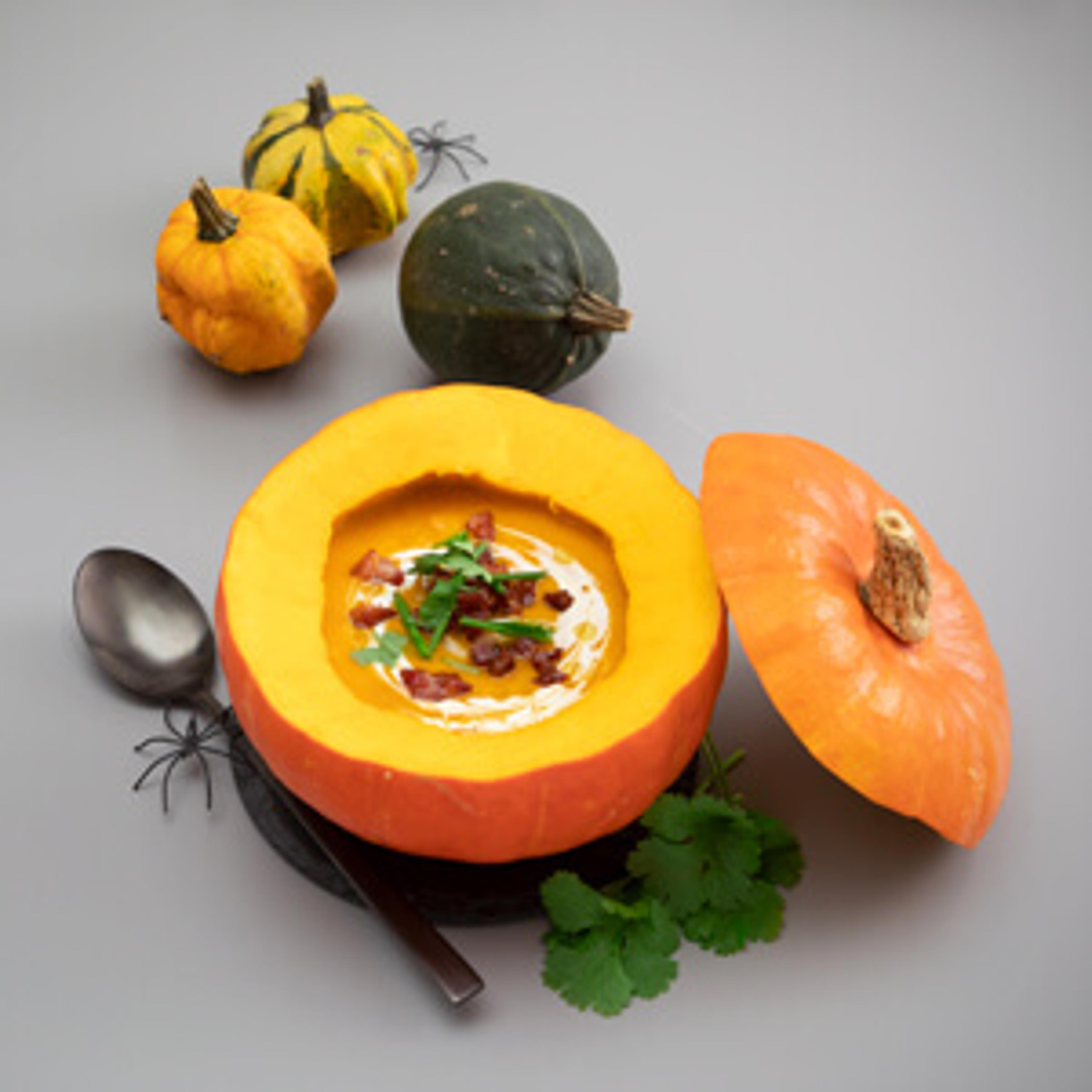 - Du kan, som et sjovt og anderledes indslag til fx Halloween-fest eller en anden festlig komsammen, servere suppen i udhulede græskar. Server for eksempel suppen sammen med en grøn salat af spidskål, spinat og smilende æg.