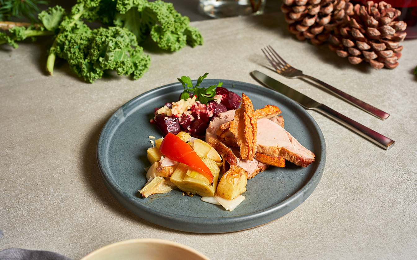 Her finder du en opskrift på den perfekte flæskesteg med sprøde svær og saftigt kød. Den serveres med lækre bagte rødbeder, toppet med revet peberrod og friske æbler samt et kartoffelfad med porrer. Velbekomme og god fornøjelse!