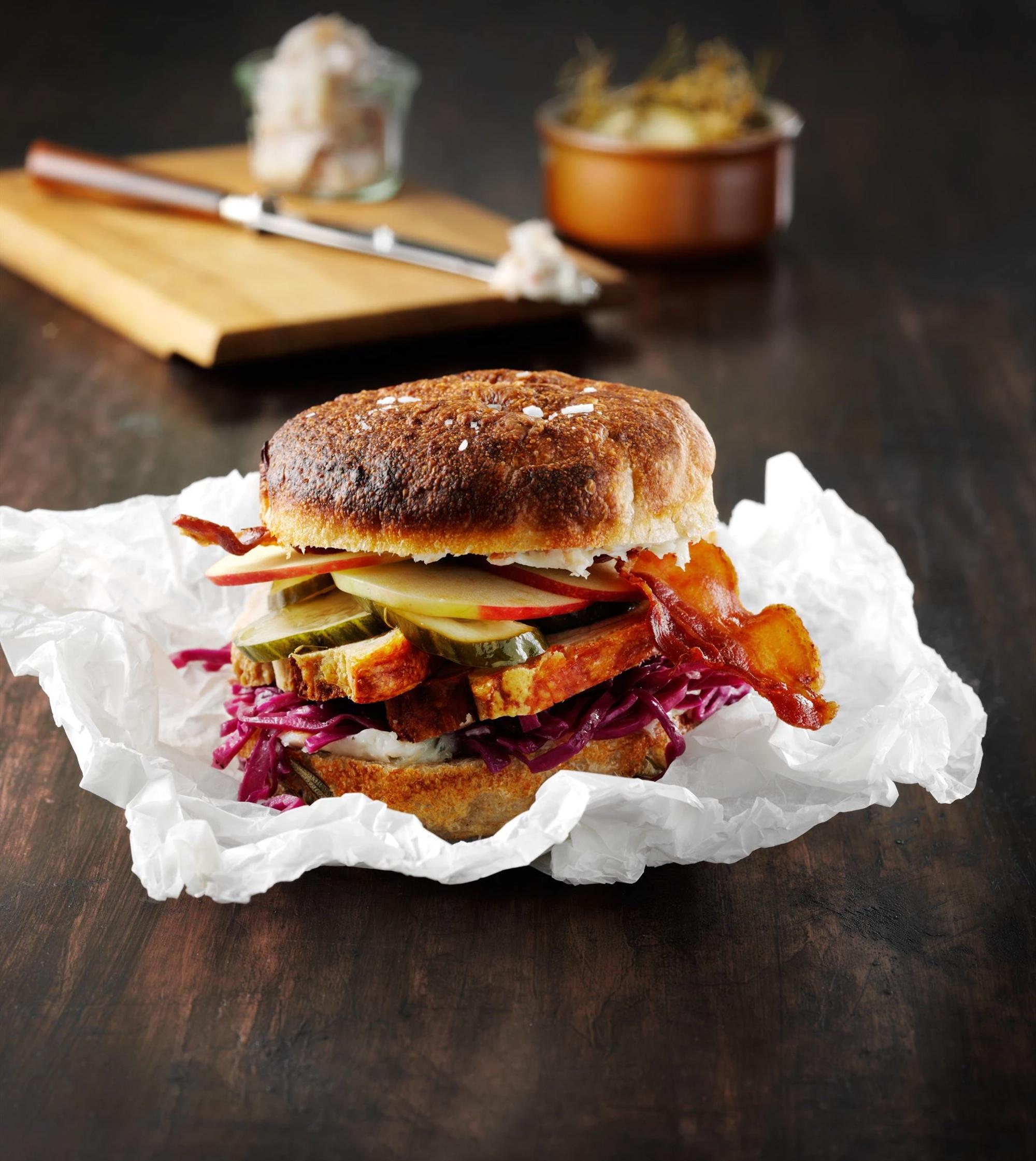 For at balancere de tunge smage i flæskestegsburgeren, kan du også tilføje tynde og sprøde skiver æble eller lave burgeren i en sandwichbolle med rosmarin.