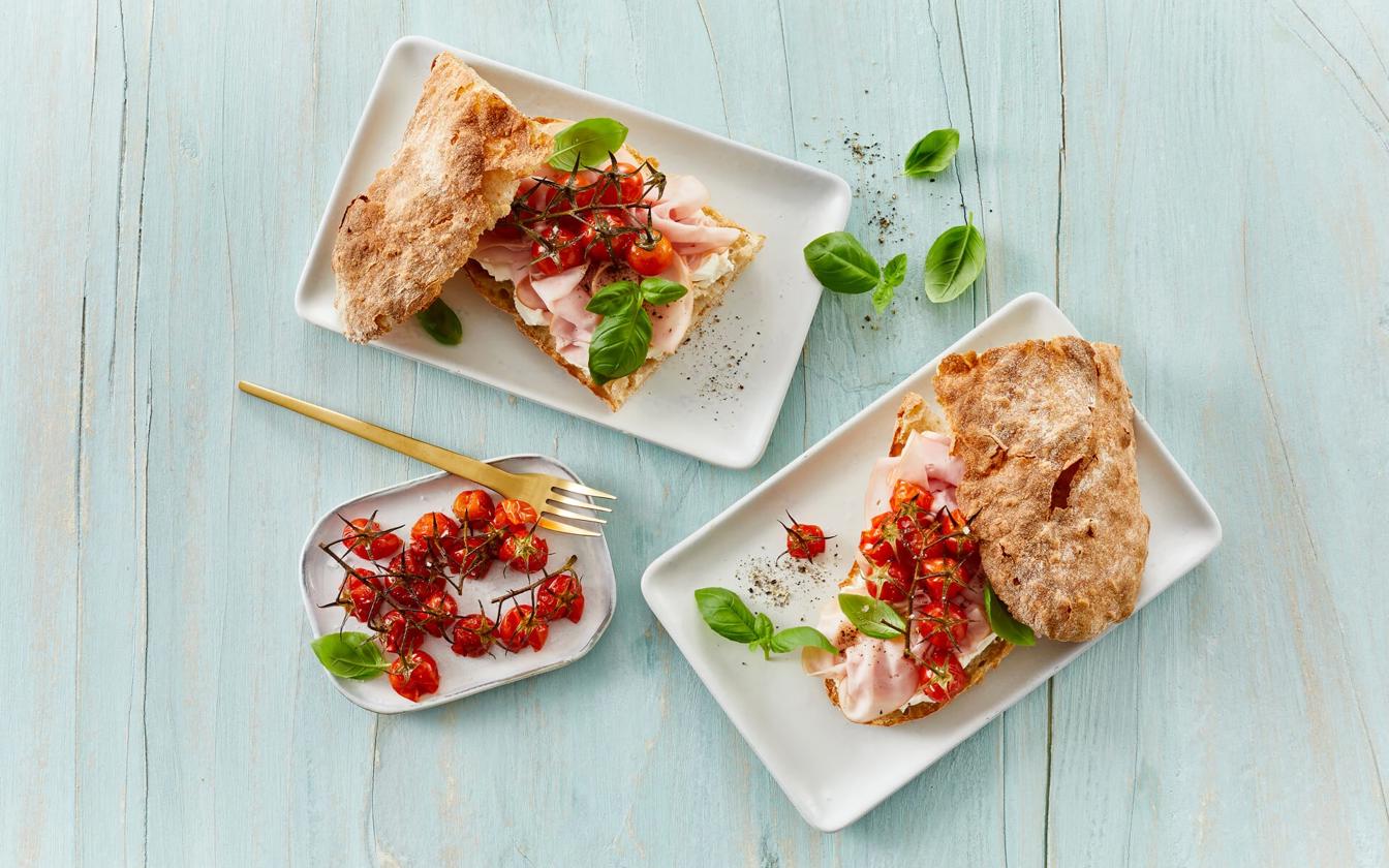 Flute med mascarpone, silkeskåret skinke, bagte tomater og basilikum