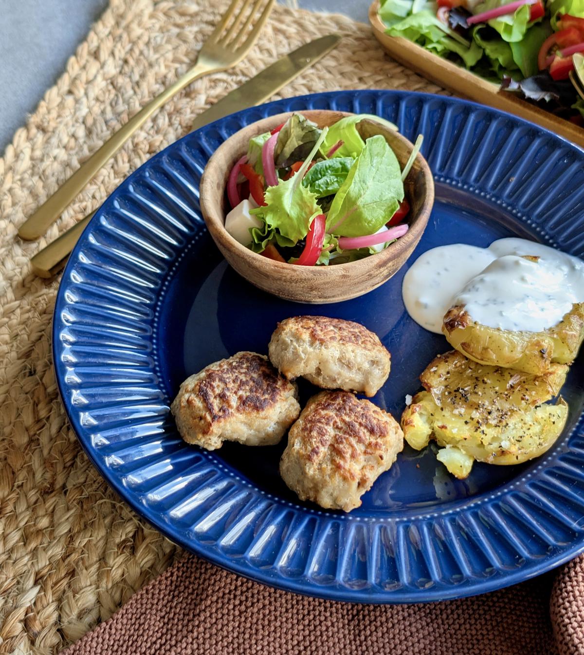 En nem og velsmagende hverdagsret med sprøde ovnkartofler, grøn salat og færdigstegte frikadeller med grønt. Et godt bud på et måltid, der passer til både store og små – og som er let at få på bordet på en travl dag.