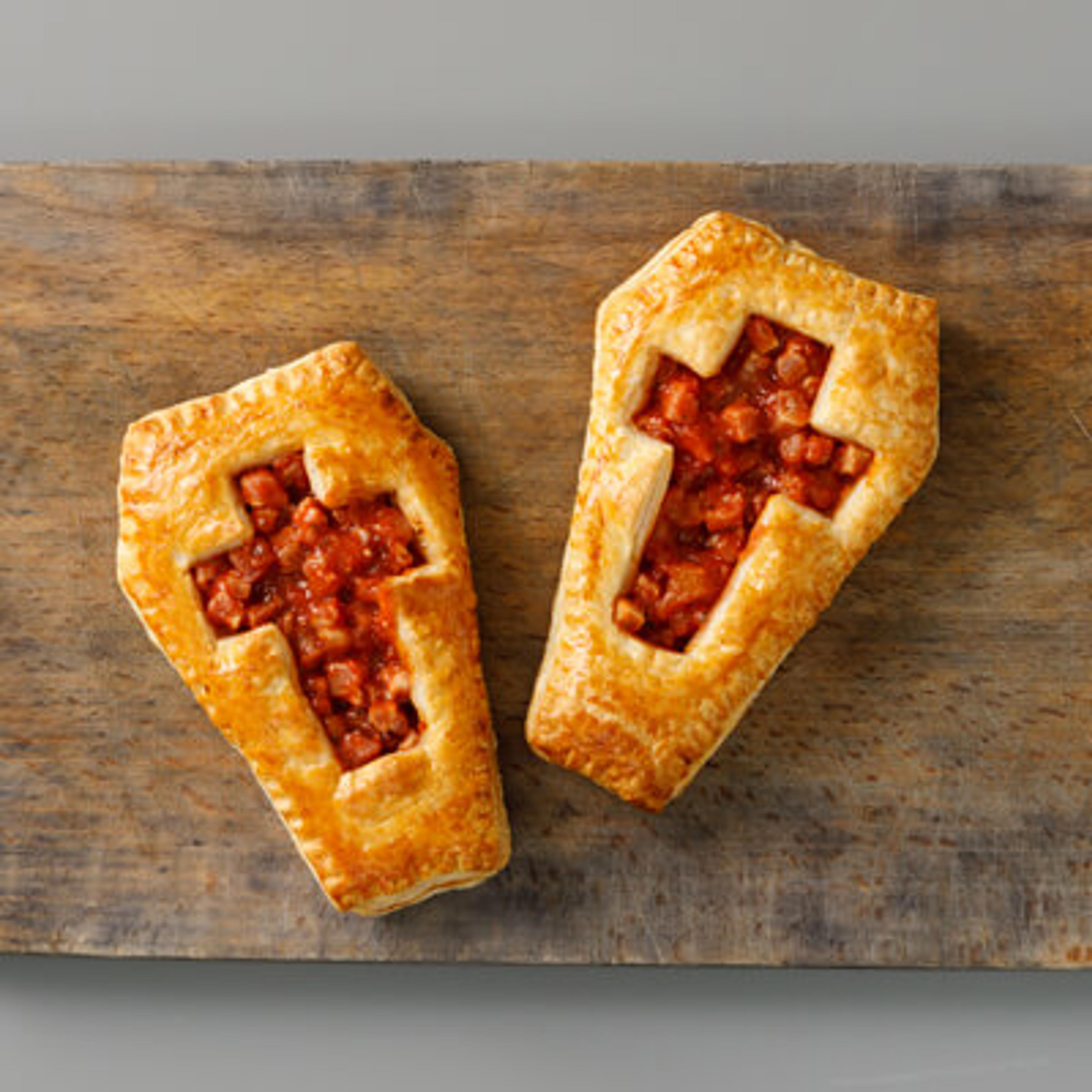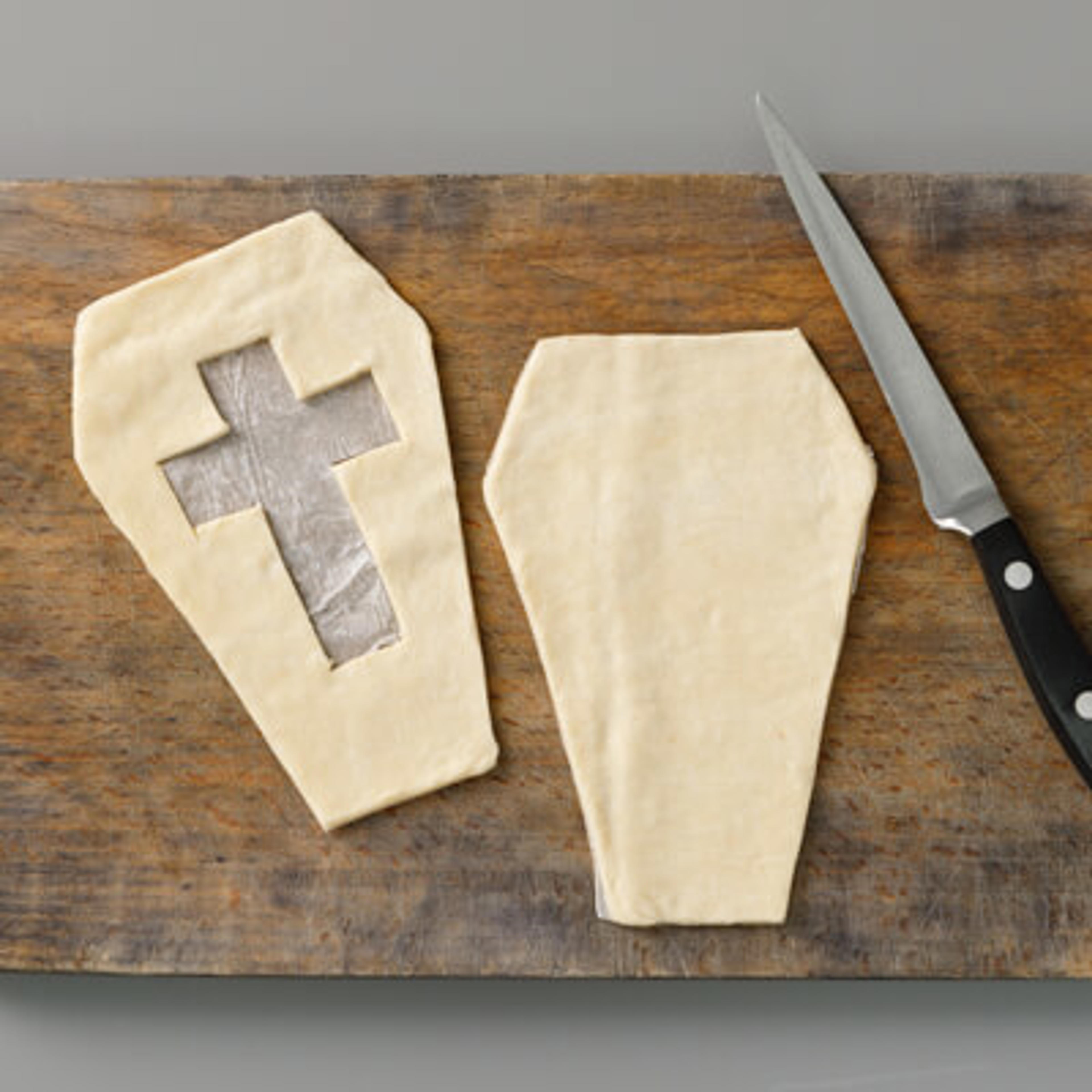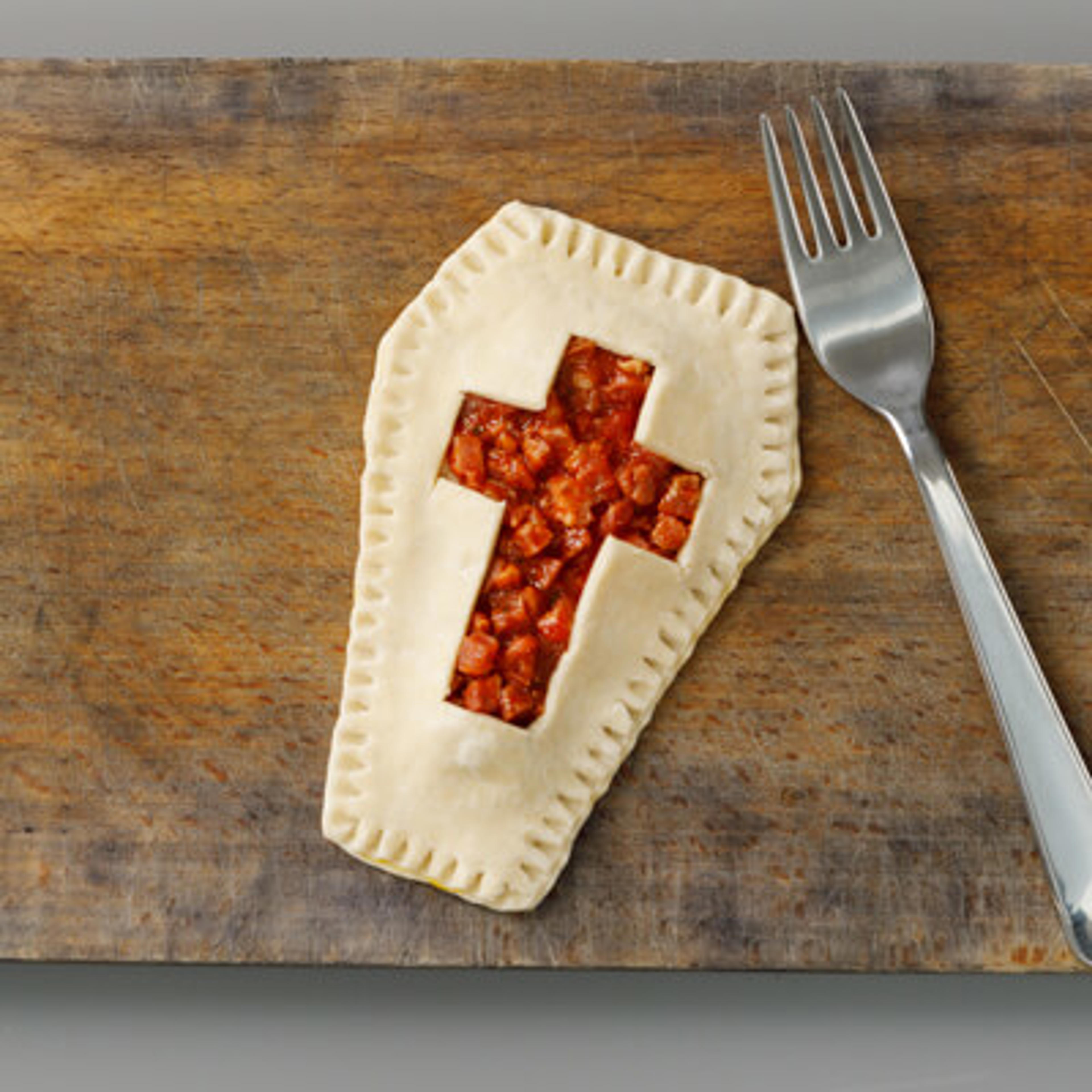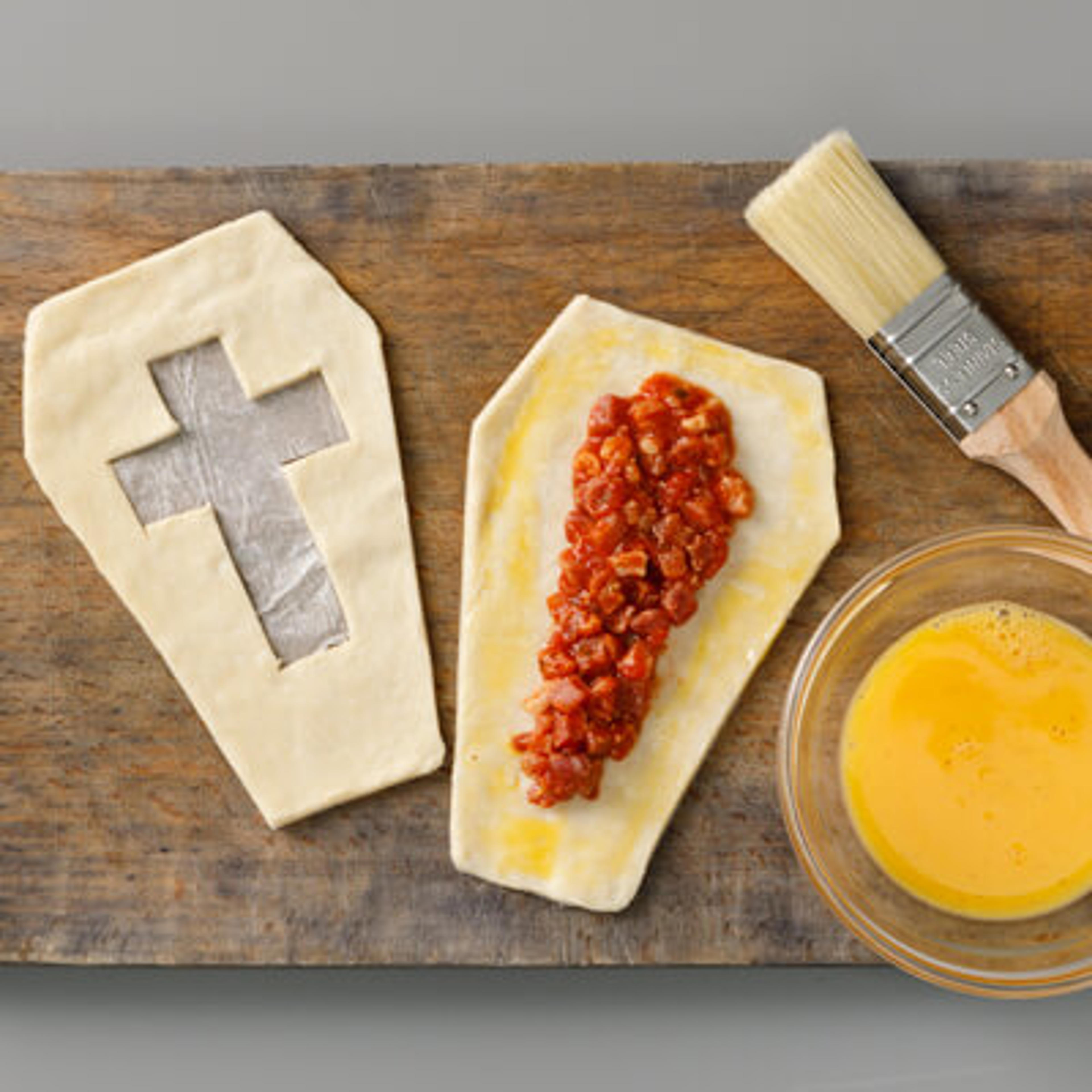 Kisterne her er et kreativt og anderledes indslag til Halloween, og minder rigtig meget om pirogger. I denne opskrift har vi fyldt kisterne med bacon og tomatsauce, hvilet smager vidunderligt sammen.Når du samler kisterne, er det vigtigt, at du husker at pensle kanten med æg, hvorefter du kan presse kanterne sammen med en gaffel.