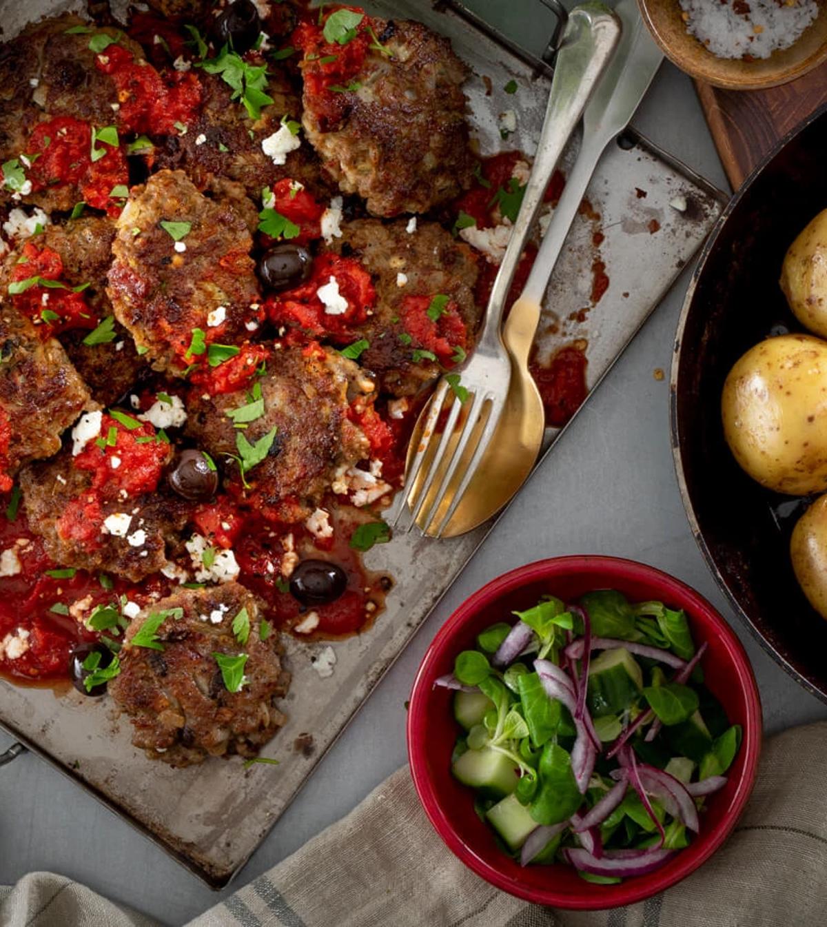 Græske frikadeller med ovnfritter og tzatziki