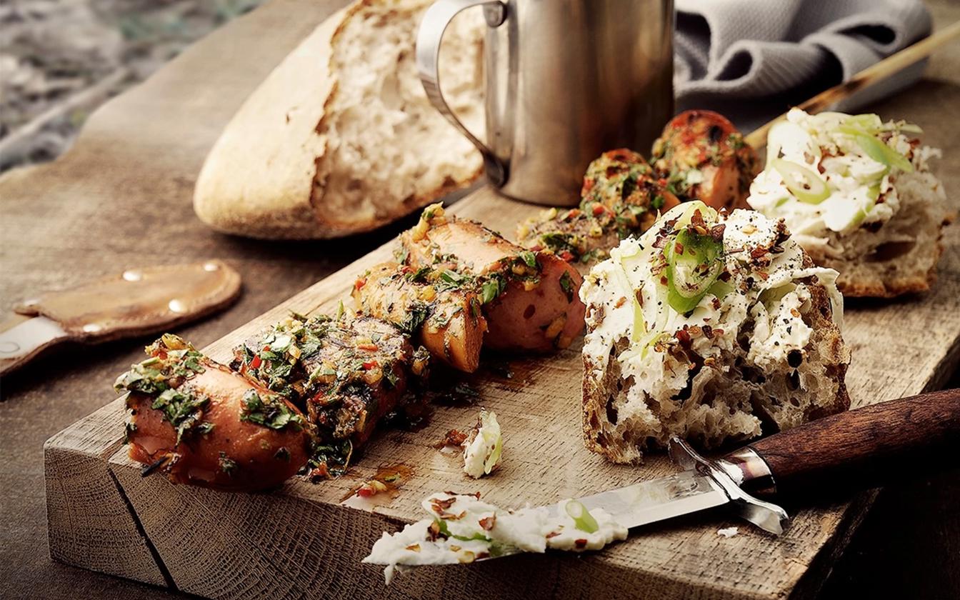 Vi har her lavet en opskrift på grillspyd med frankfurter og bøffer, hvortil vi serverer surdejsbrød. Du kan også bruge almindeligt brød, hvis du ikke har et surdejsbrød.