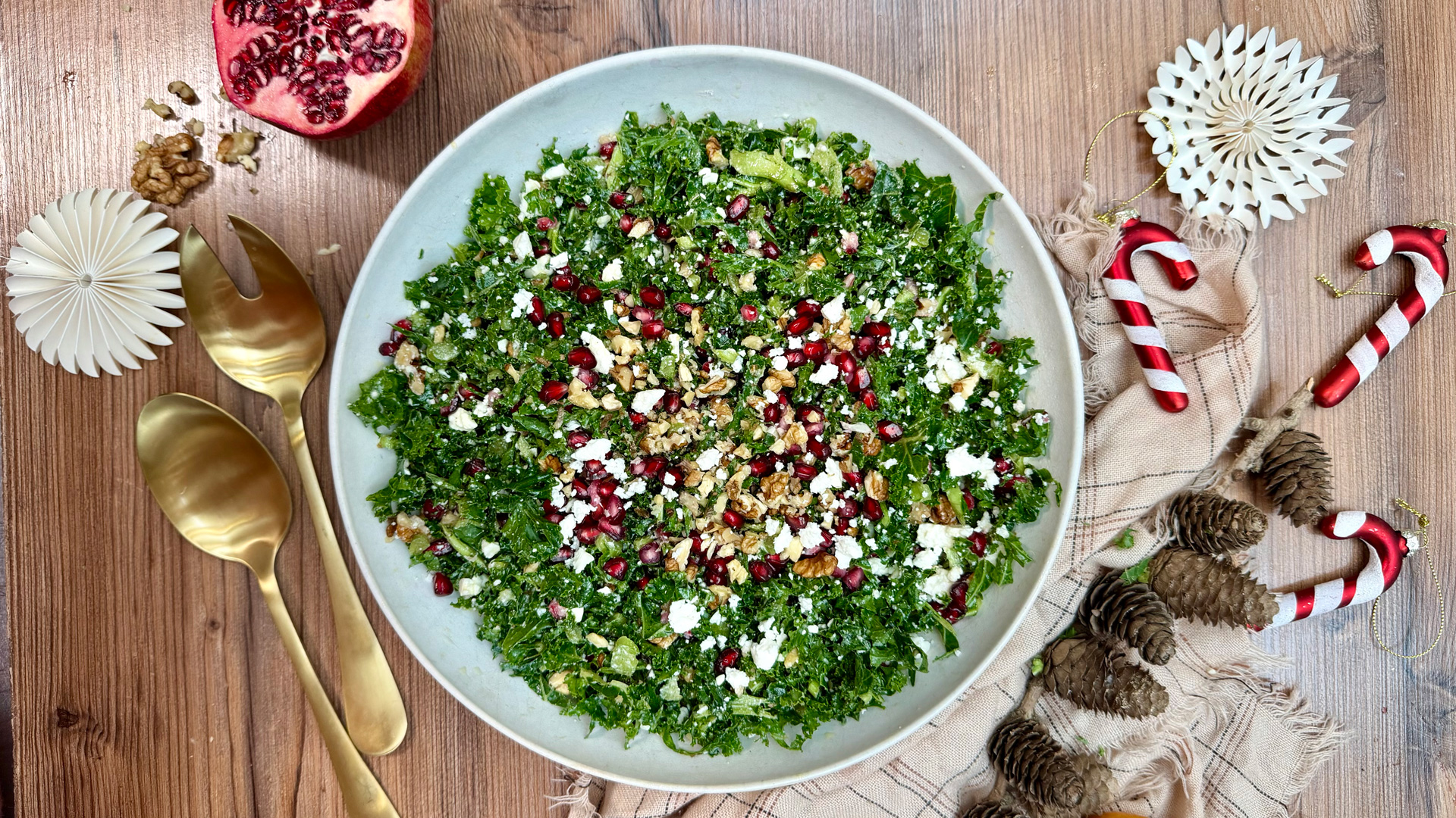 Leder du efter et frisk og farverigt modspil til den klassiske julemad? Denne julesalat med grønkål, granatæble, feta og sprøde nødder kombinerer det sprøde og cremede med sødme og syrlighed – alt sammen bundet sammen af en smagfuld dressing med honning og appelsin. Perfekt som tilbehør til både flæskesteg, and eller vegetarmenuen, og et oplagt valg, når julebordet skal have et grønt indspark.
