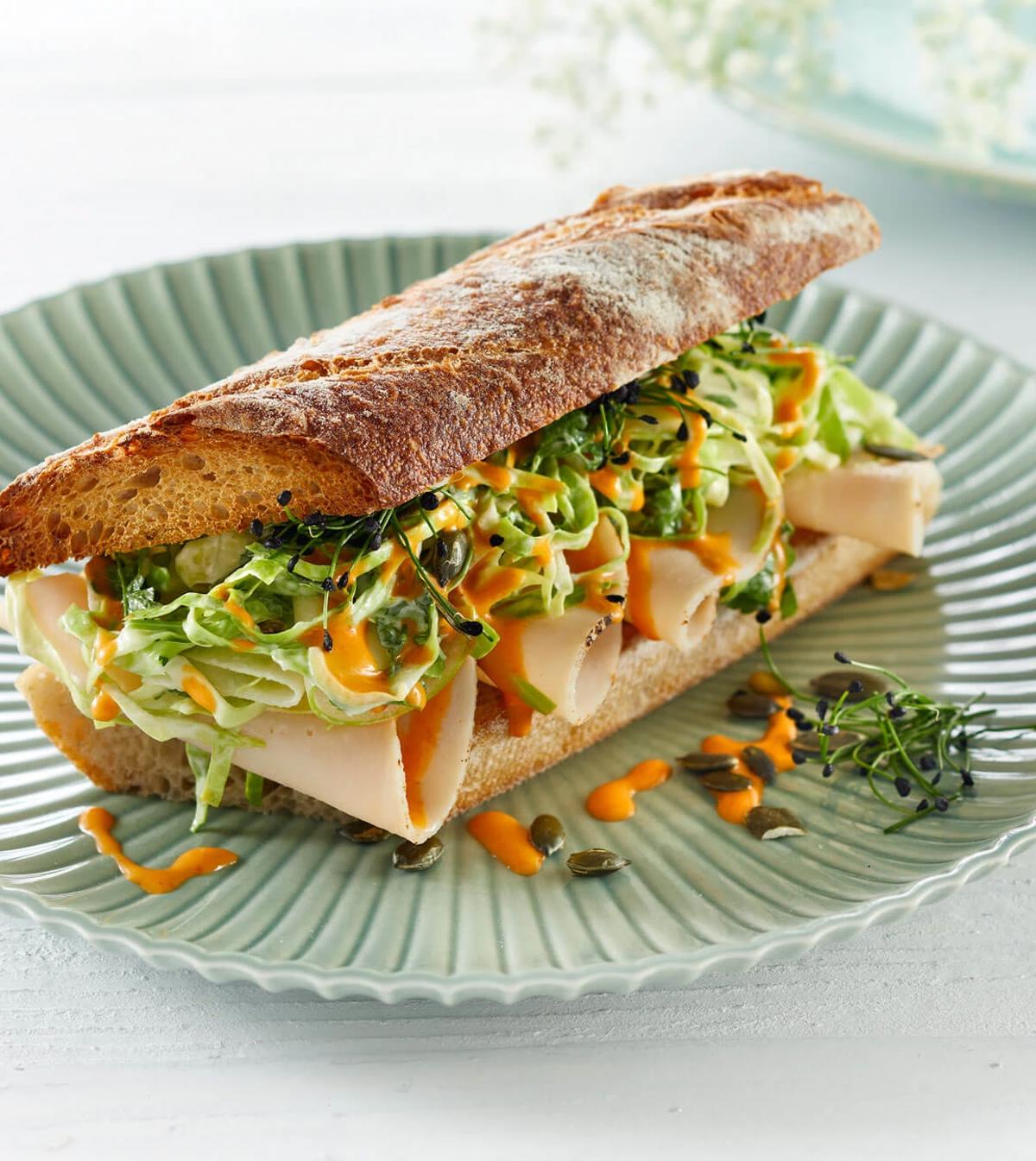 I opskriften bruger vi vores klassiske kyllingebryst, som er kogt og grillet let, men du kan nærmest bruge alle de former for pålæg, som du har lyst til. Prøv vores hamburgerryg for et stykke pålæg med en lækker røget smag. Eller gå veggie-vejen og vælg vores veggie sandwich skiver, hvis du har lyst til et måltid uden kød.