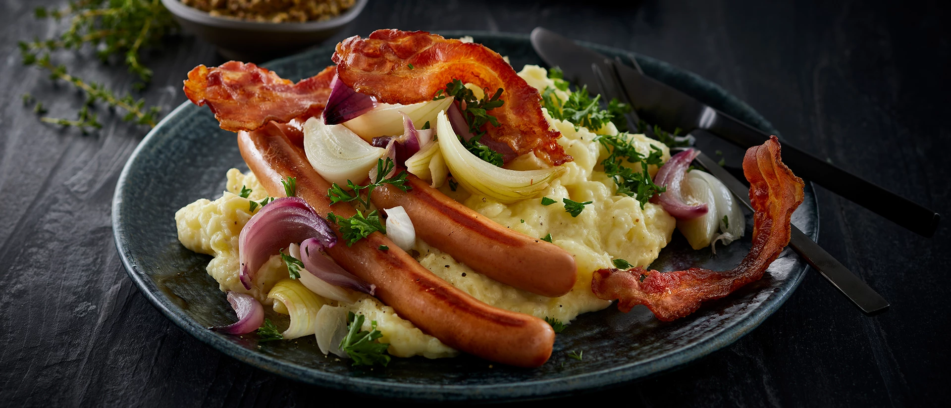 Vores opskrift på grov kartoffelmos med sprøde pølser og saftig bacon er lige netop dén slags partner. Toppet med vores smagfulde wienerpølser, sprød bacon samt frisk persille, har du her en ret, der holder dig til ilden på selv den mørkeste efterårsdag.