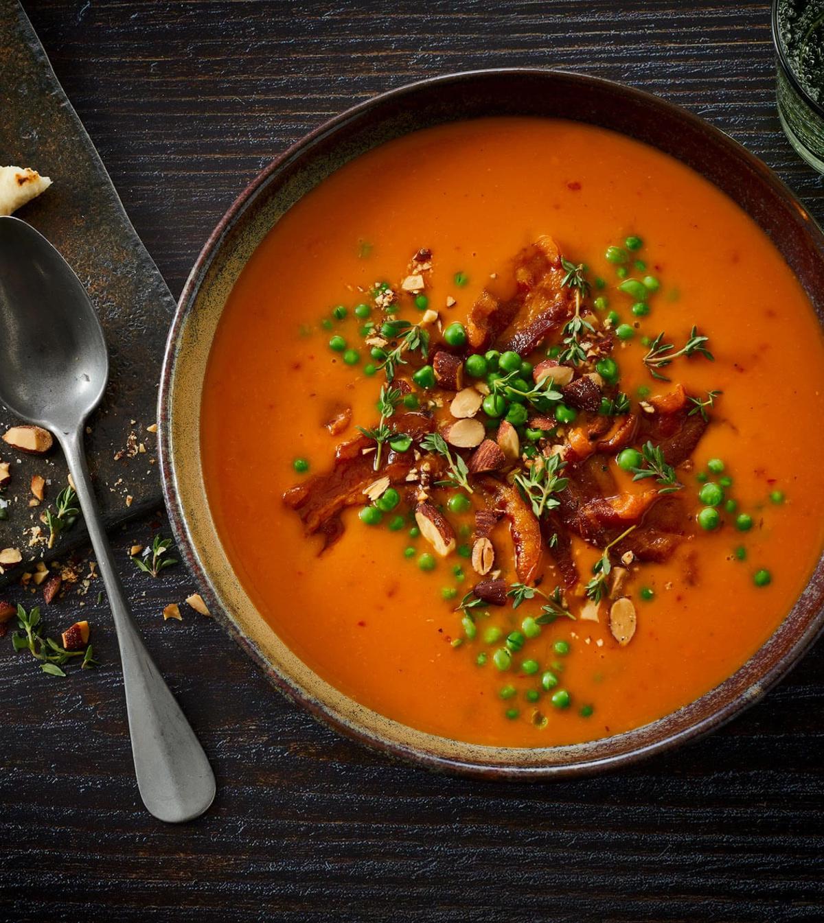 Her får du en suppe hvor gulerod forenes med varme krydderier som chili og ingefær i en lækker, cremet gulerodssuppe. Det er en dejlig vintersuppe, som vi her topper med en god skefuld mandler, der er ristet sprøde i smør med spidskommen og hvidløg.