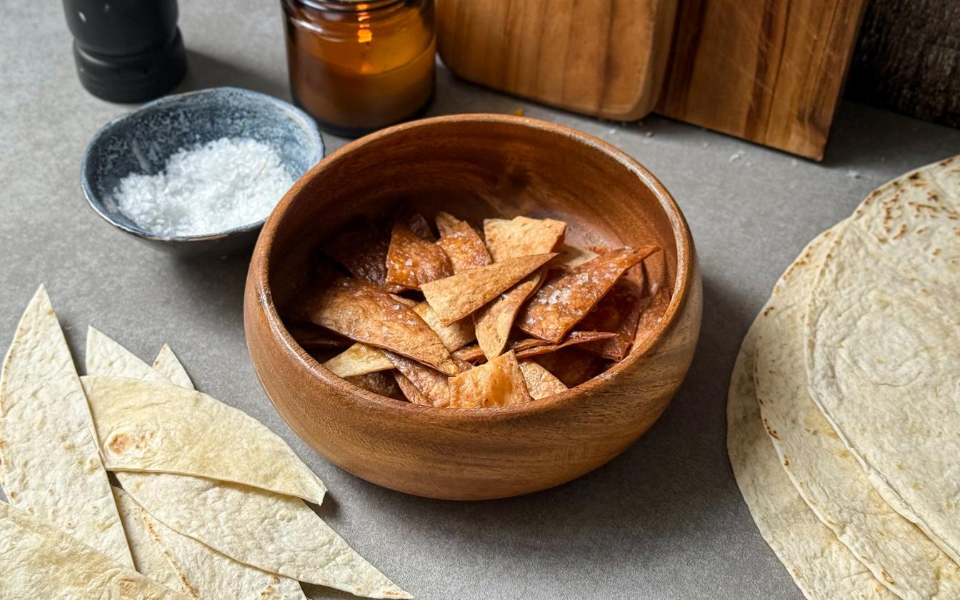Sprøde, hjemmelavede tortillachips er den perfekte måde at bruge rester af tortillapandekager på. De er supernemme at lave, og du kan selv styre både mængde og smag – om du vil holde dem enkle med olie og flagesalt, eller tilføje et drys krydderier som paprika, spidskommen eller chiliflager. Brug dem som tilbehør til mexicanske retter, som en hurtig snack eller til at dyppe i guacamole og salsa.