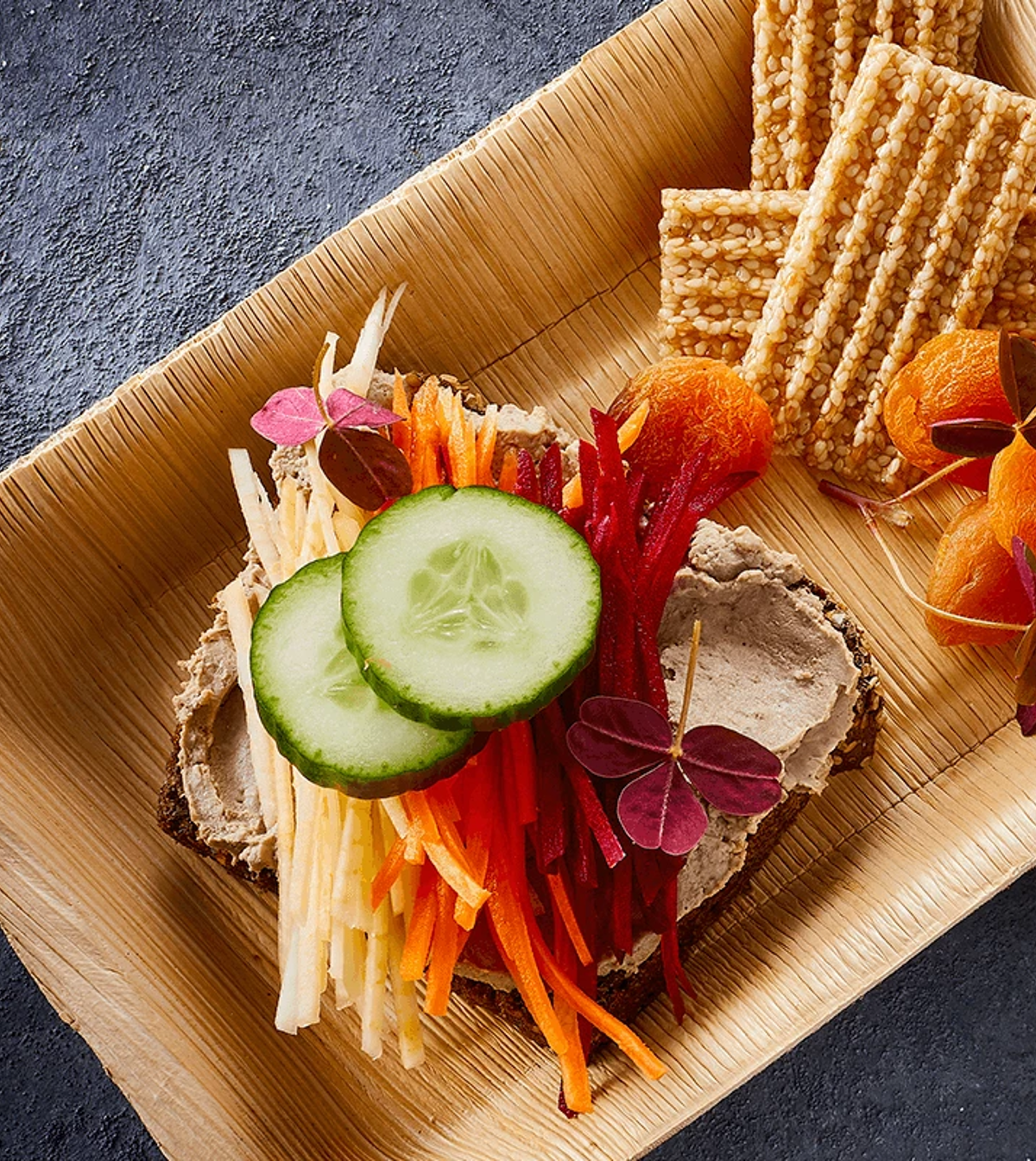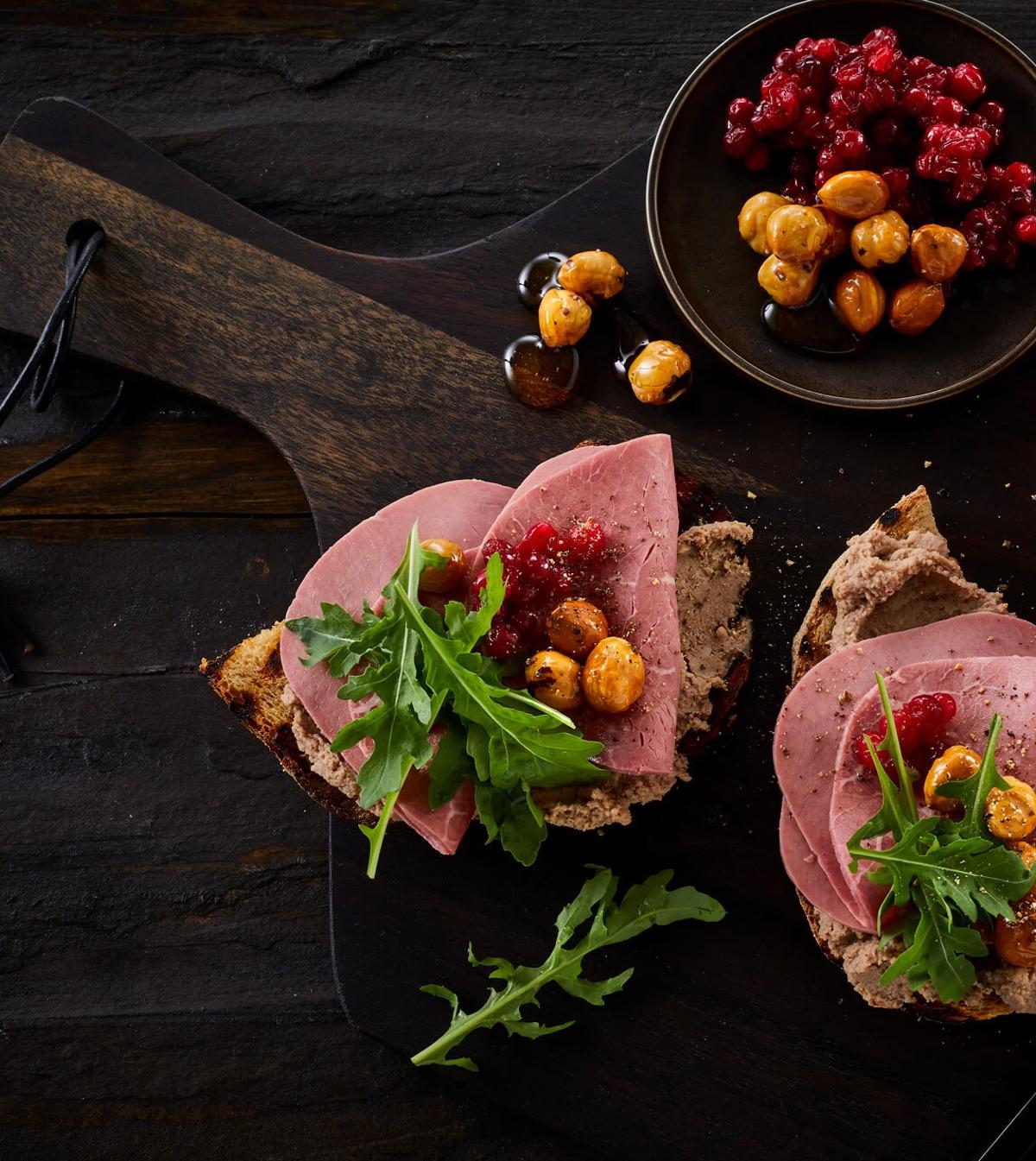 Kombinationen af det rustikke rugbrød, toppet med fyldig veggie postej giver en rig og varm smag med en velafbalancerede krydrede nuancer. Den knasende veggie bacon tilføjer en saltet og sprød kontrast, mens de sauterede champignon giver en fyldig umami-smag.