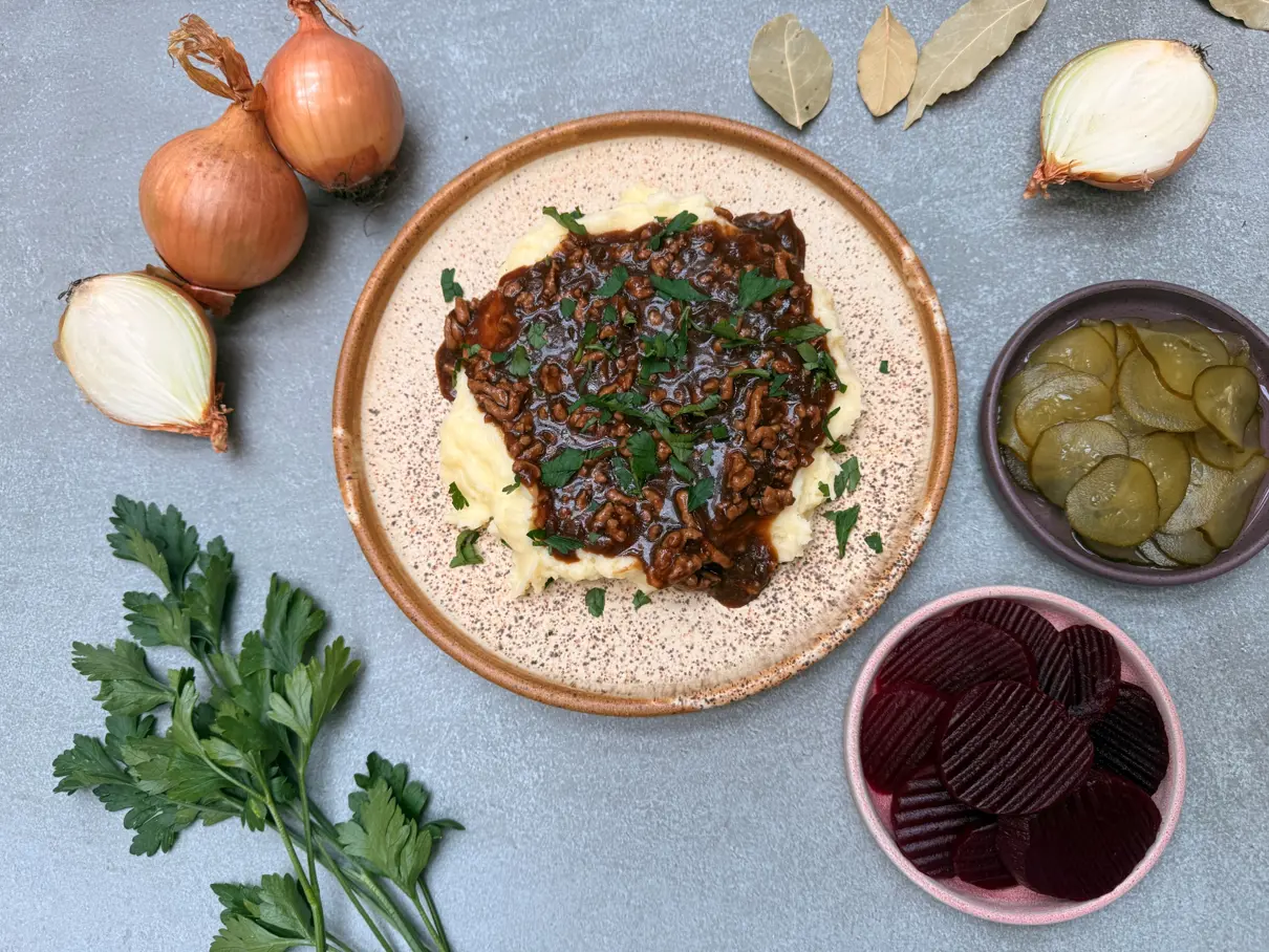 Gratineret hamburgerryg med sprød grøn salat