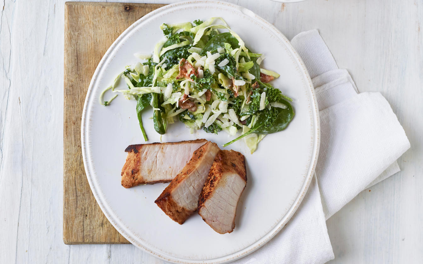 Hvidløgsmarineret filet af gris med spinatsalat og bacon