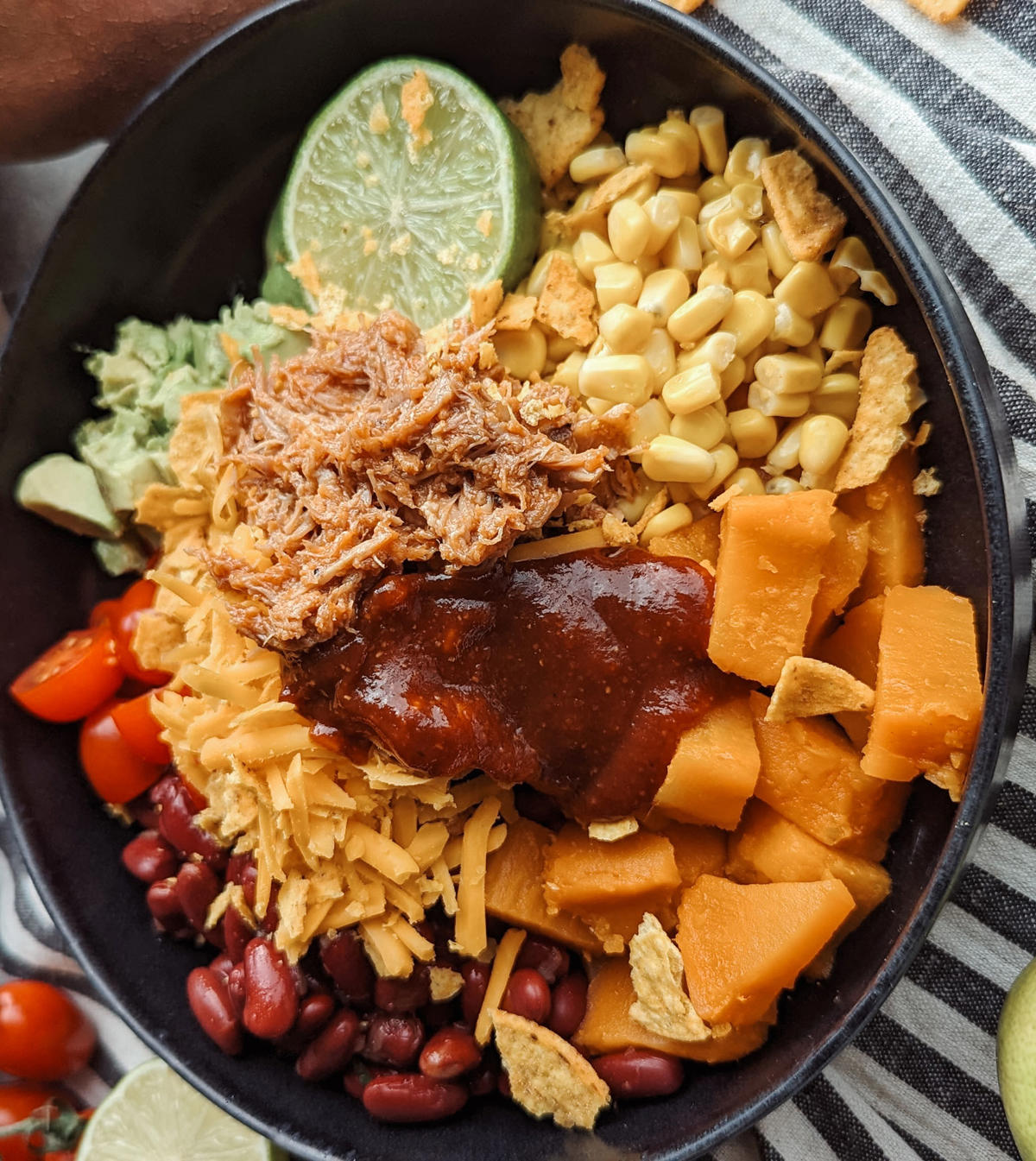 Denne farverige hytteost bowl kombinerer mør Tulip Pulled Pork med bagte søde kartofler, cremet hytteost, frisk babyspinat og tern af avocado. En skål fyldt med smag og kontraster – fra det krydrede og møre kød til det kølige og friske grønt.