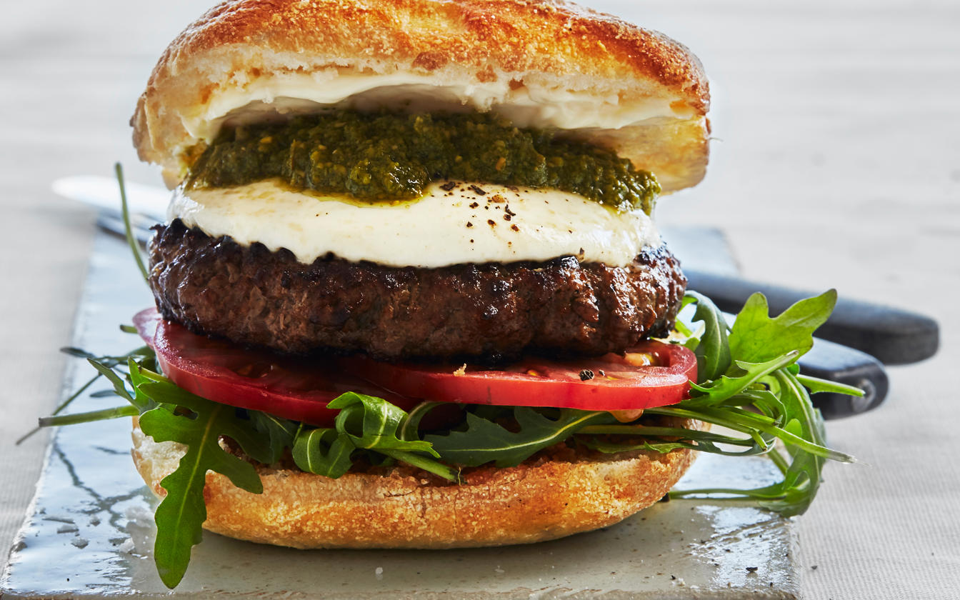 Få en smag af Italien med vores italiensk inspirerede pesto burger! Saftigt oksekød, kombineret med frisk pesto, mozzarella og tomat, giver denne burger et lækkert twist. Perfekt til dig, der vil prøve noget nyt og velsmagende til aftensmaden.