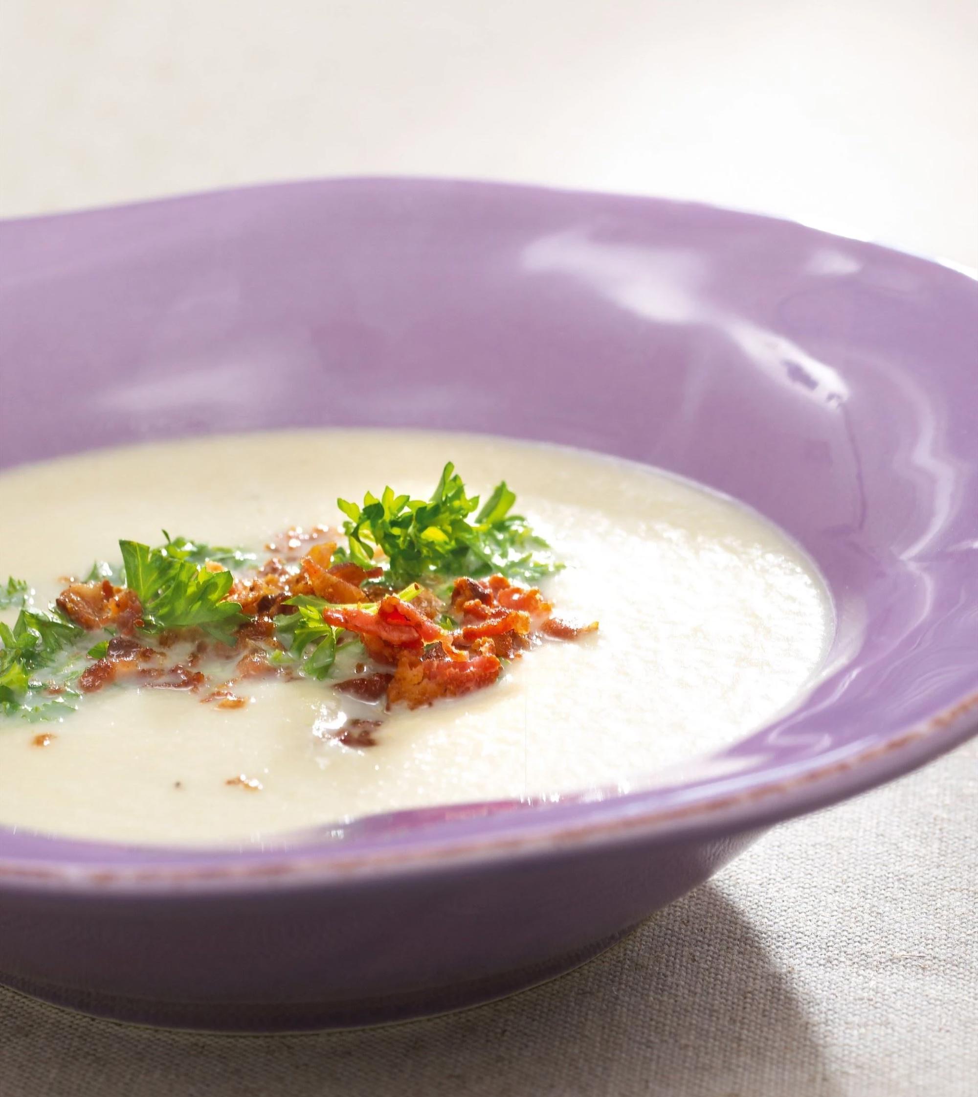 Jordskokkesuppe er en enkel og smagfuld suppe. Jordskokker giver den søde og naturlige smag, som gør suppen perfekt til hele familien. I denne version er den klassiske suppe toppet med sprødstegt bacon i tern og friske æbletern. Prøv den næste gang der står suppe på menuen.