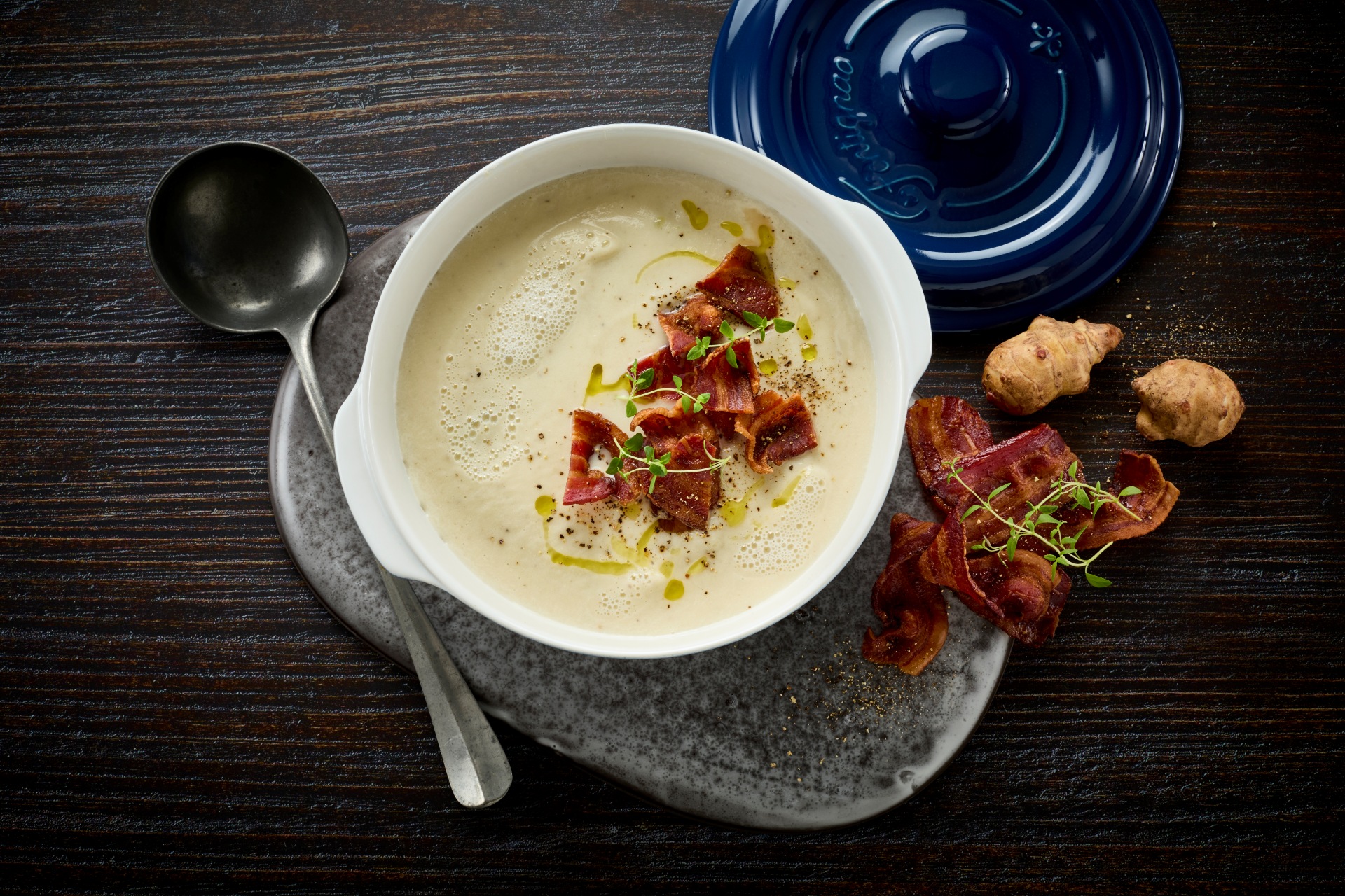 Vores cremede jordskokkesuppe med hjemmelavet fond er en oplagt ret til kølige dage. Du får både dybde, sødme og et lille pift fra citron – og med bacon og frisk timian som topping, bliver det ekstra lækkert. Brug den som forret, let aftensmad eller weekendforkælelse.
