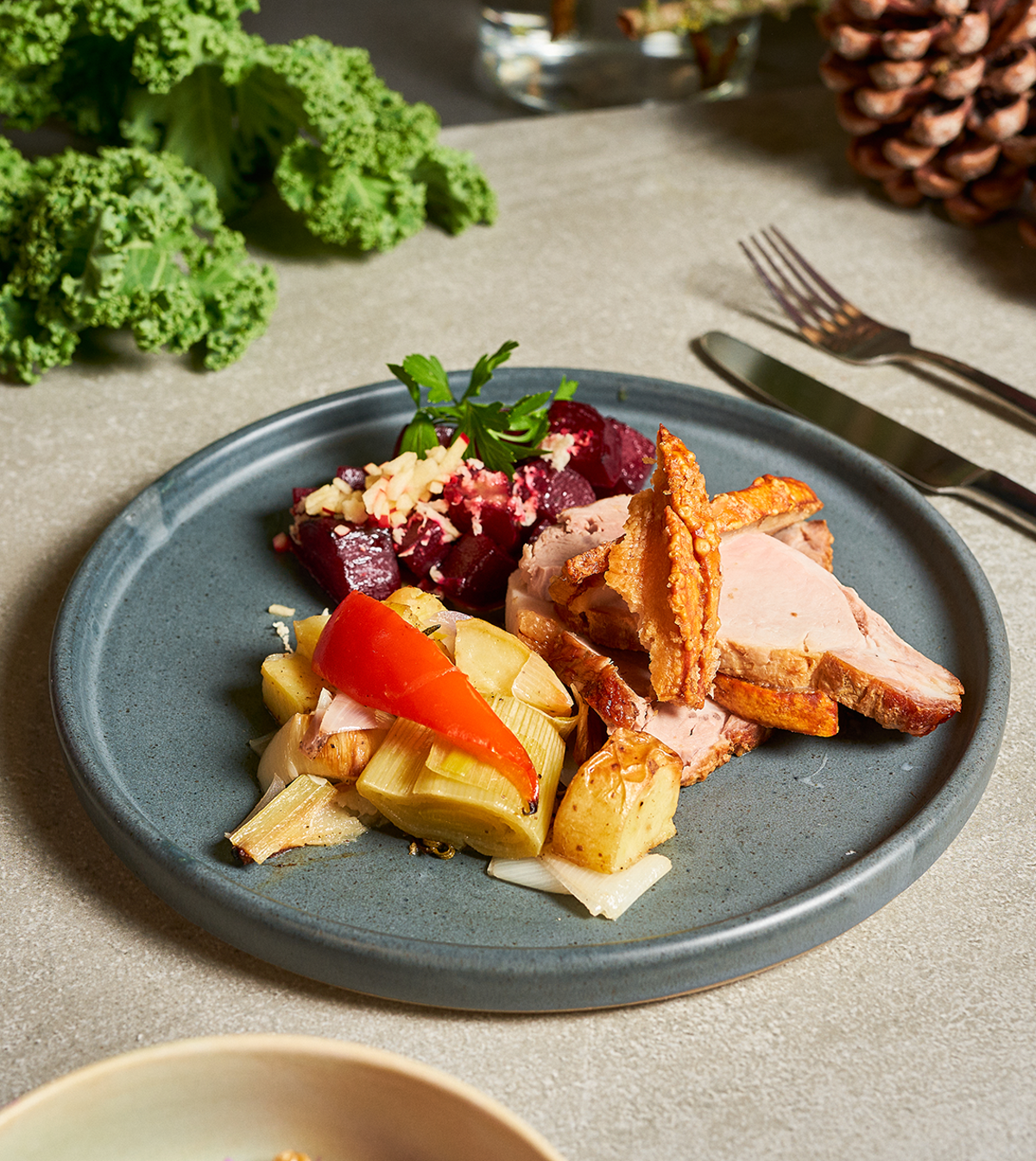 Flæskesteg er fast inventar i mange danske hjem til jul. I denne opskrift på en saftig juleflæskesteg serveret med persillerødder og rødbeder i ovnen, er der fuld knald på både julesmage og julefarver.