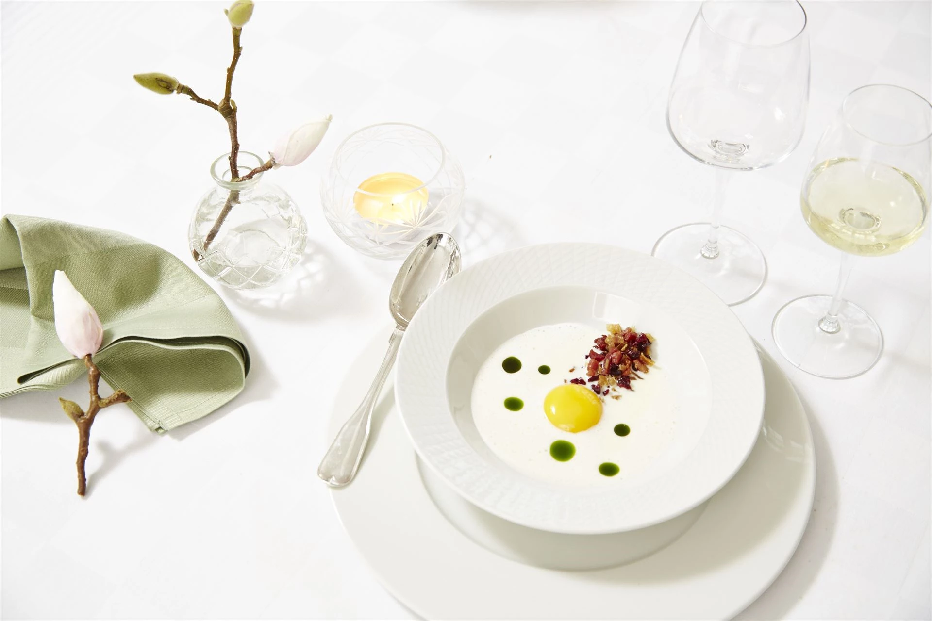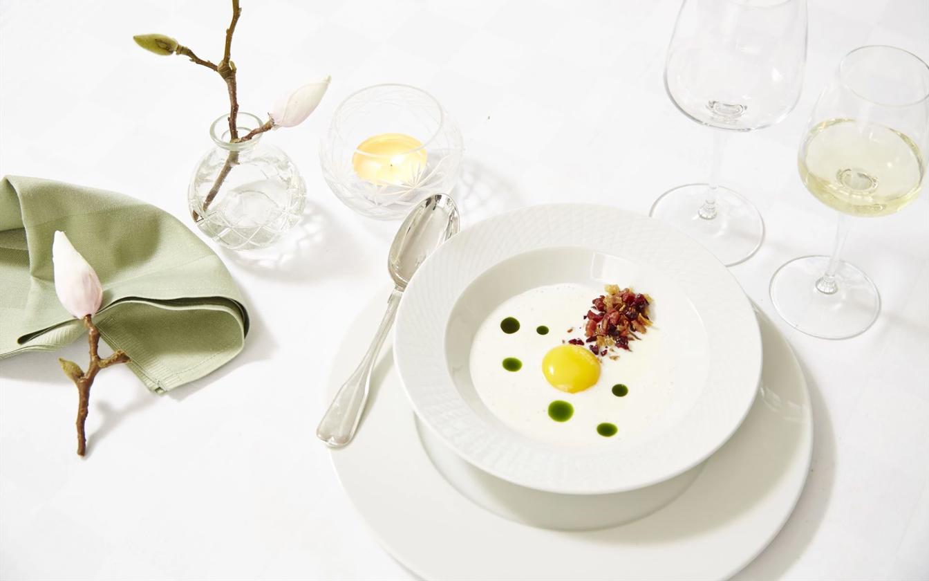 Kærnemælks-suppe med rygeost, æggeblomme, sprød bacon og dild-olie
