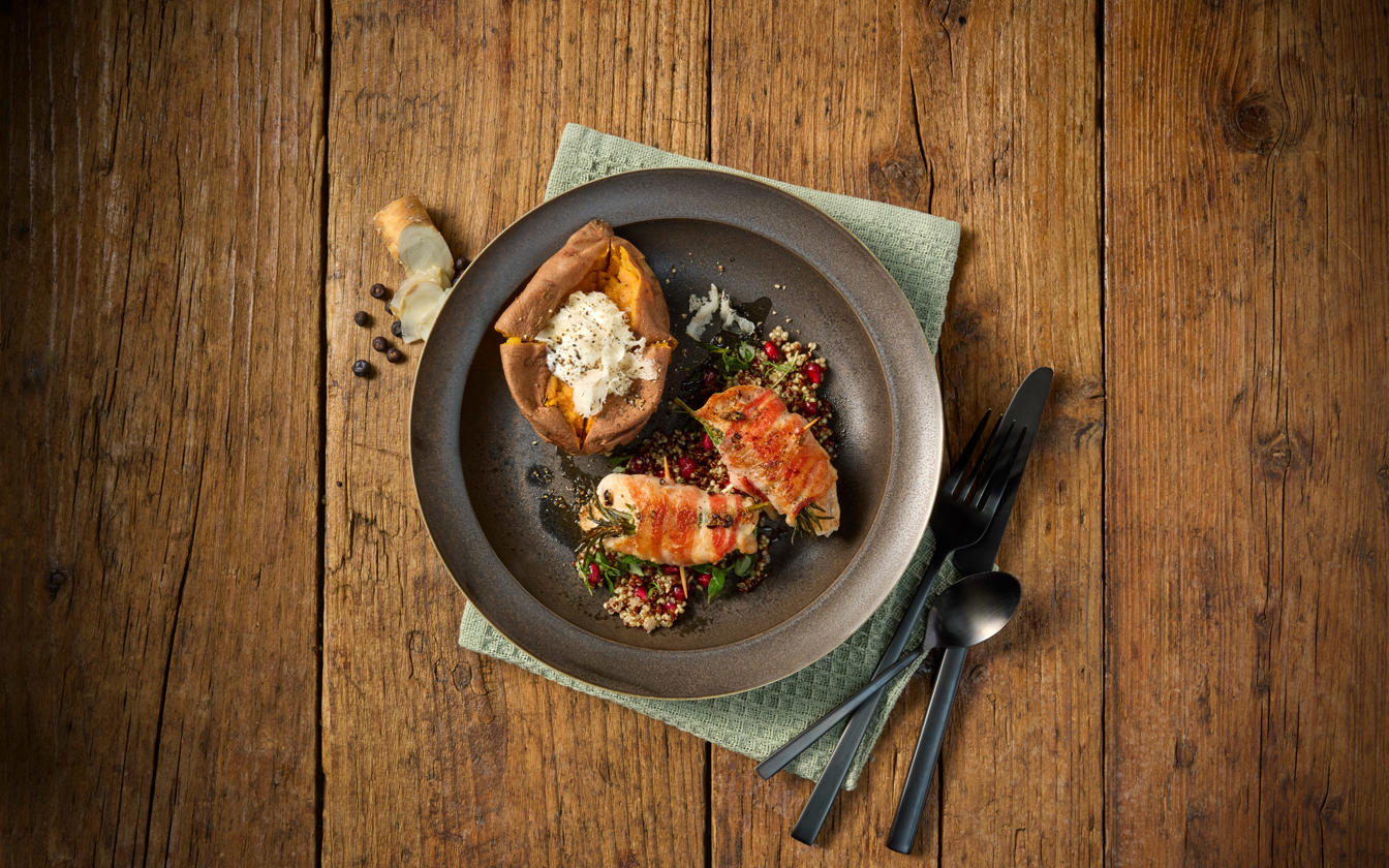 Kalkunbryst med bacon er en smagfuld ret, hvor saftige kalkunstykker krydres med rosmarin og enebær, pakkes ind i sprød bacon og serveres med bagte søde kartofler og en frisk quinoasalat med granatæble. En lækker kombination af krydret, sprødt og friskt – perfekt til både hverdag og gæster.