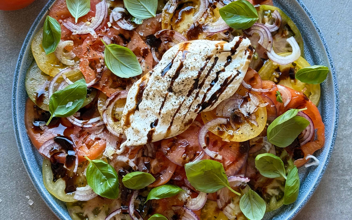 Friske tomater, rødløg og cremet ost – tomatsalaten er en ægte sommerklassiker. Den er enkel at lave, men fuld af farve, saft og smag. Med både mozzarella og burrata som valgmuligheder kan du justere præcis, hvor cremet og mild du ønsker den. Tomaternes sødme balanceres af syren fra balsamico og den aromatiske basilikum. Perfekt som tilbehør til både en stor steg, en saftig bøf og grillede grøntsager – eller bare som et friskt indslag midt i et større grillbord.