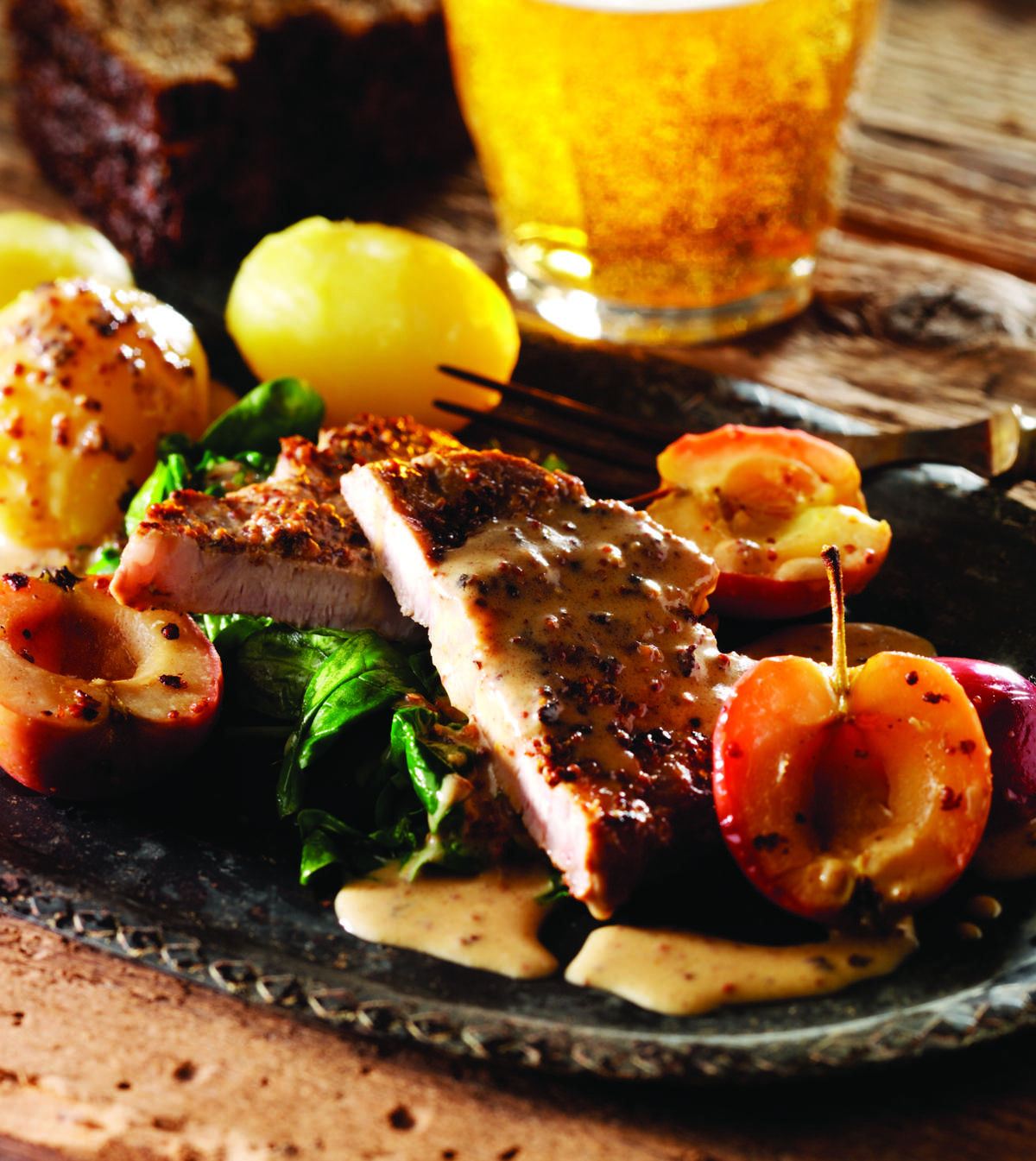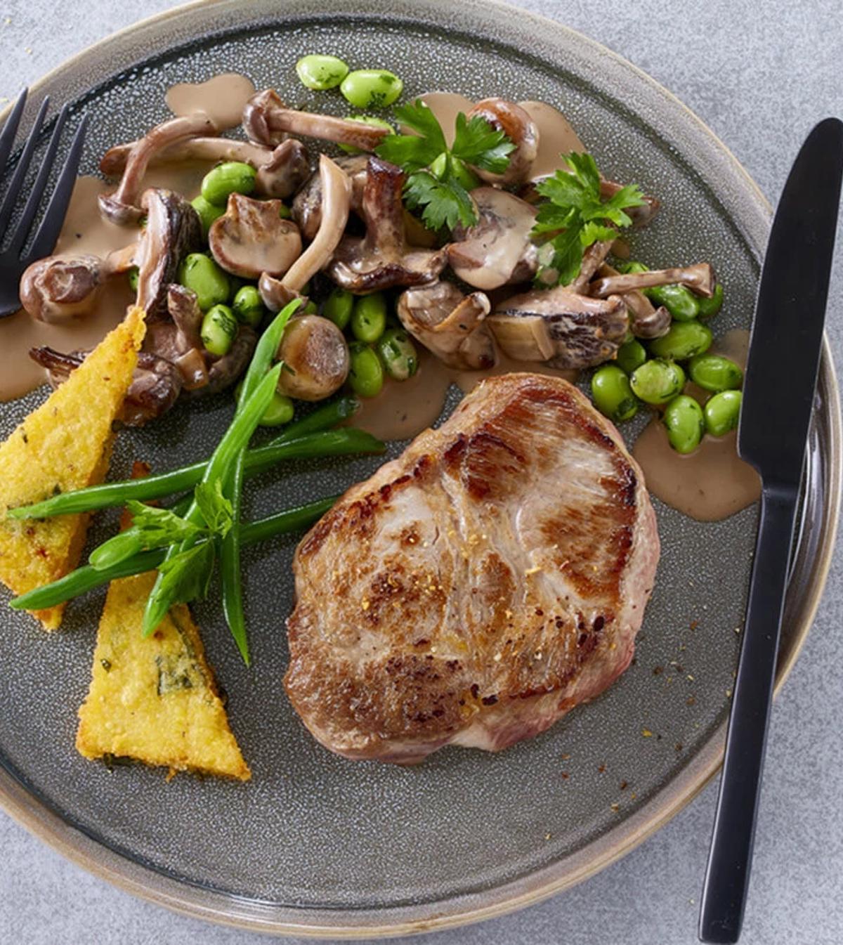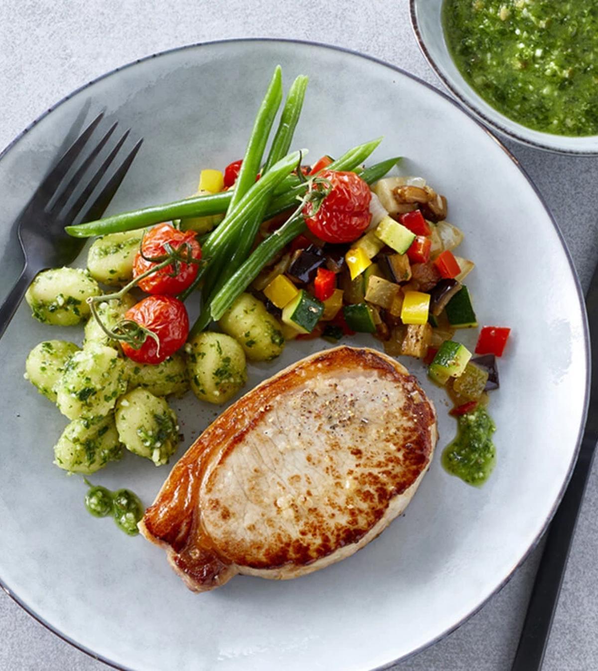 Prøv vores krogmodnede koteletter - de er møre og fulde af smag. Her har vi valgt at servere dem med tortellini i en blå ostesauce og toppet med blåbær og pære.