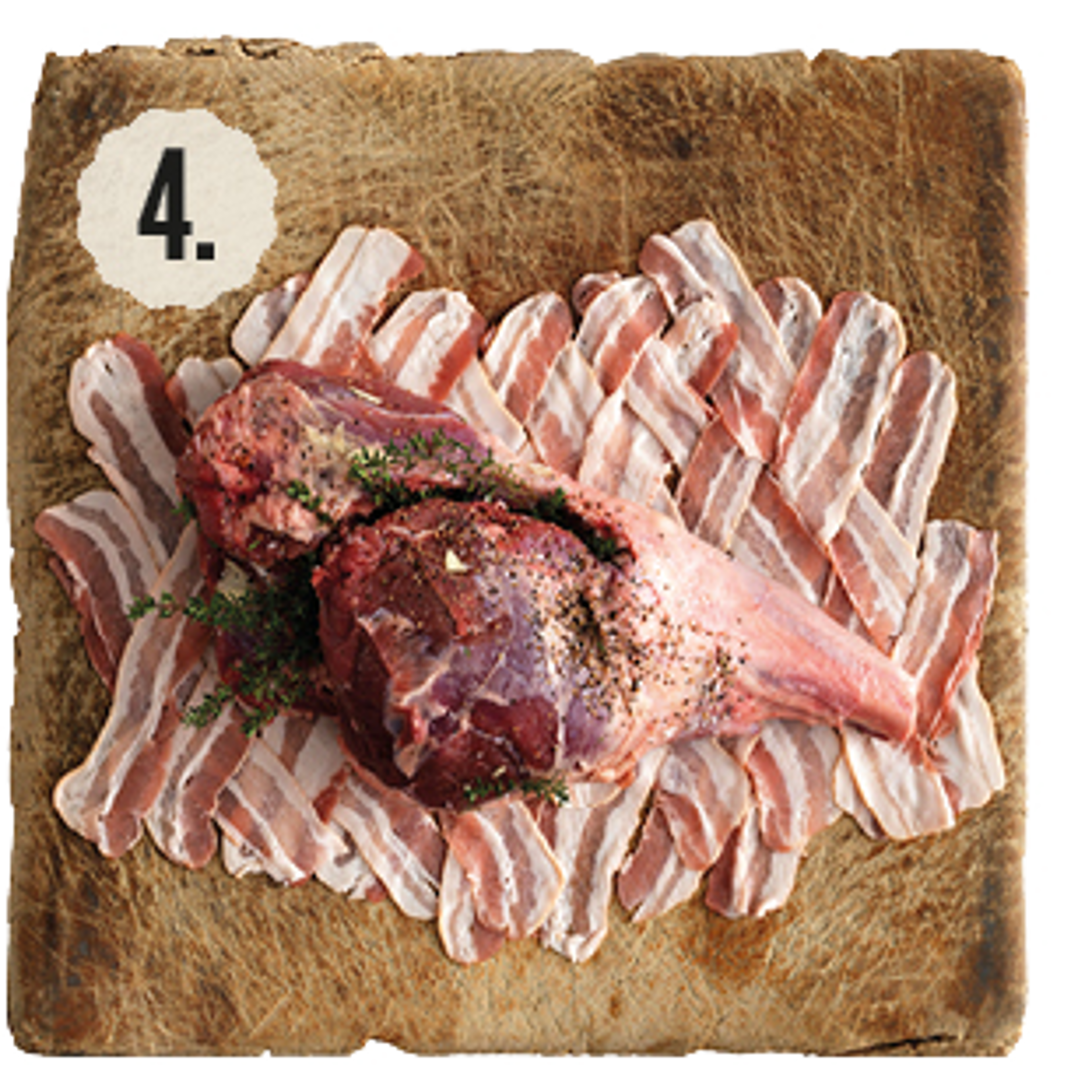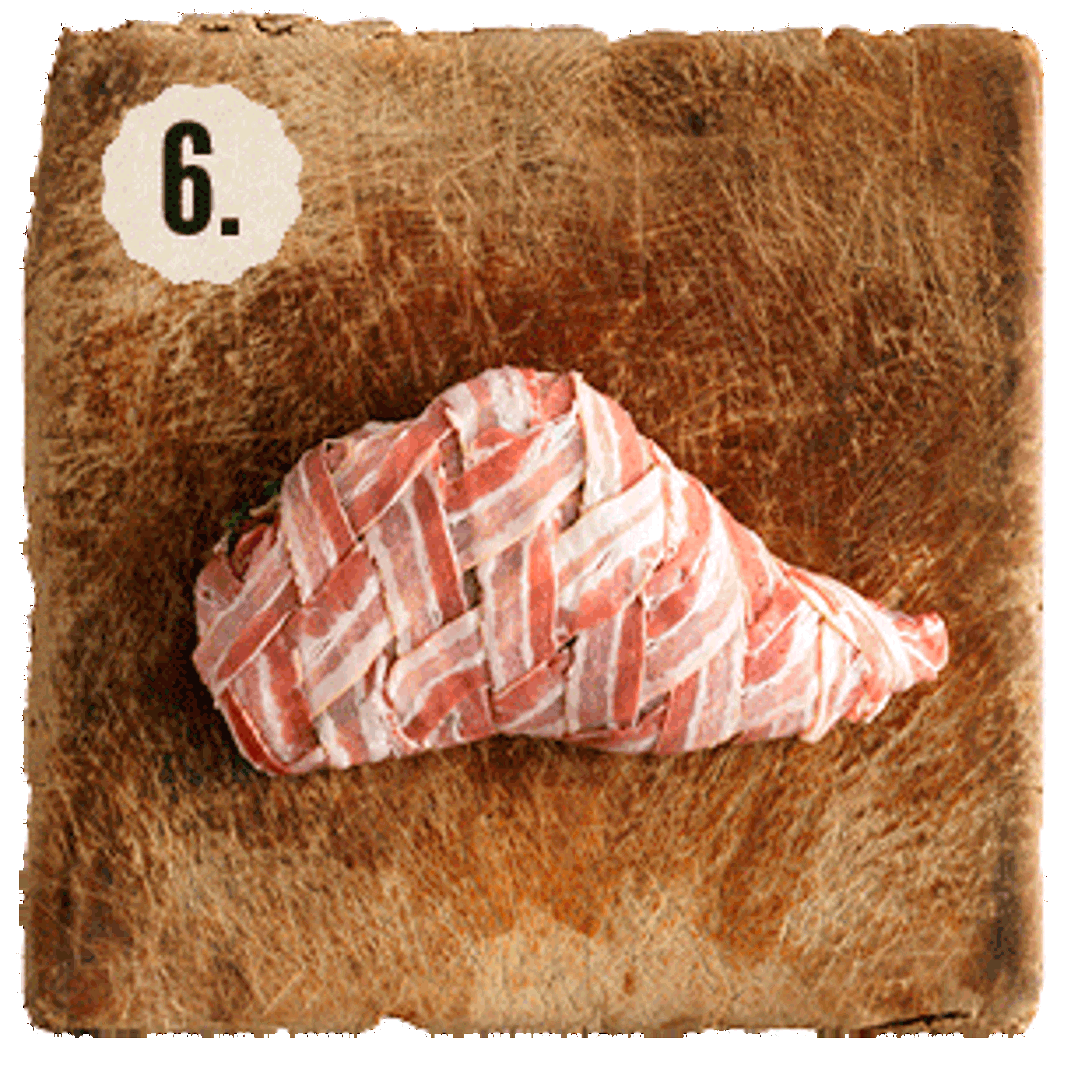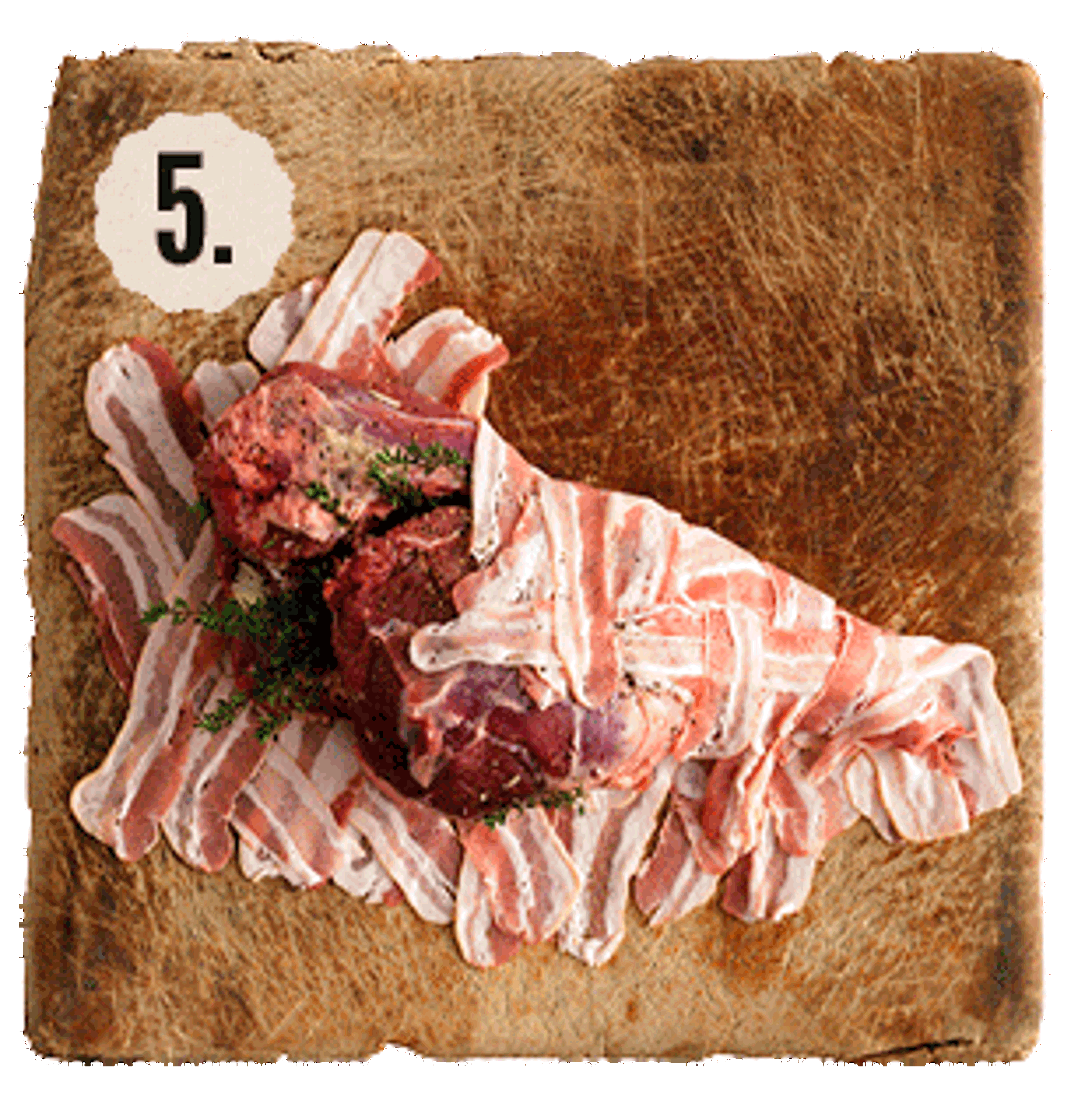 Udbenet lammebov fyldt med krydderurter og svøbt i flettet bacon. Smukt, smagfuldt og sjovt at lave. Prøv også med andre stege som f.eks. mørbrad, skinkesteg, en hel kylling, et kalkunbryst eller lignende.