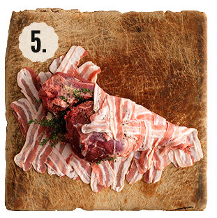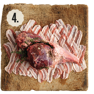 Udbenet lammebov fyldt med krydderurter og svøbt i flettet bacon. Smukt, smagfuldt og sjovt at lave. Prøv også med andre stege som f.eks. mørbrad, skinkesteg, en hel kylling, et kalkunbryst eller lignende.
